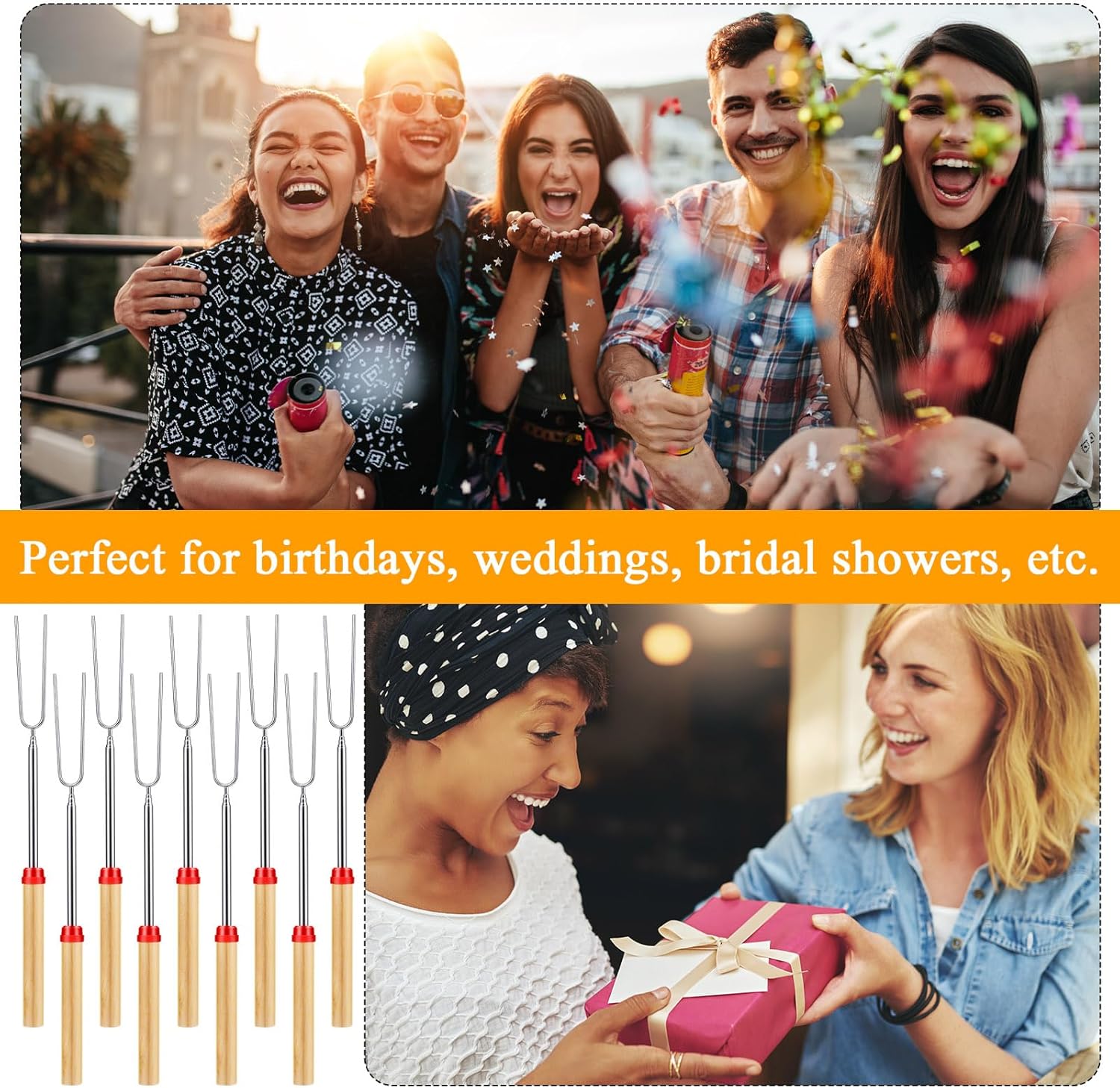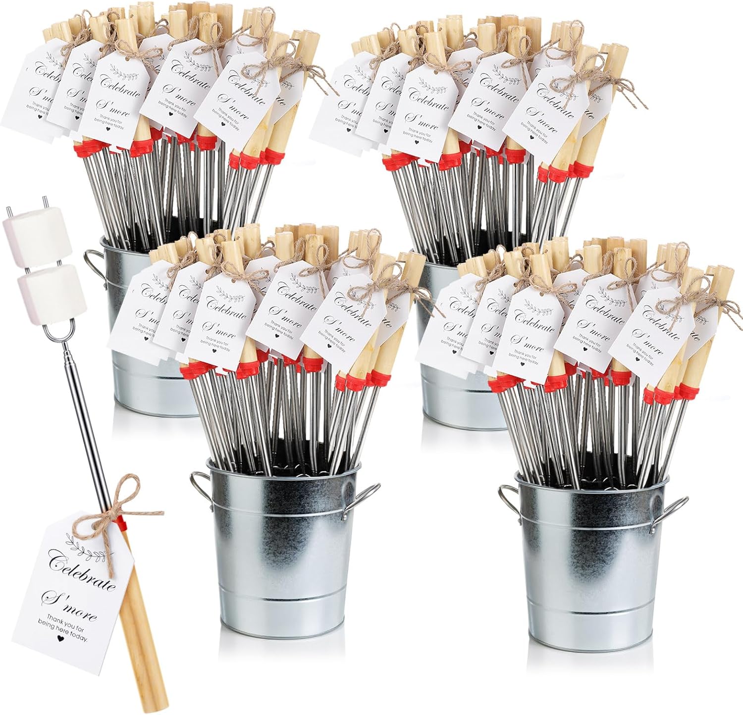 Features: Crafted from quality stainless steel, these retractable skewers for marshmallows are suitable for any cooking adventure whether it's a backyard fire pit, bonfire pit or campfire. The handle design not only makes them look stylish but more importantly, it lends a level of safety. With the capacity to extend up to 32 inches, they help ensure everyone, especially kids, remains a safe distance from the fire. Not only do you get 48 skewers for fire pit, but it also includes 48 celebrate s'more tags. These coated paper tags, measuring at 1.97 x 3.15 inches/ 5 x 8 cm, are the appropriate embellishment for your celebrations. Furthermore, we've added a roll of 32.81 ft/ 10 meters hemp rope for attaching the tags or for any number of creative uses. Specifications: Material: Smores sticks: stainless steel Label: coated paper Size Smores sticks: can be stretched up to 32 inches, 3 times its original length of 12 inches Hemp rope: 32.81 ft/ 10 meters Label: 1.97 x 3.15 inches/ 5 x 8 cm Main color: Smores sticks: red, transparent Package includes: 48 x Smores sticks 48 x Celebrate smore tags 1 x Rope Notes: Manual measurement, please allow slight errors on size. The color may exist a slight difference due to different screen displays. Pointed items are included, please be careful when using. Winding risk may exist, children should use them under supervision.