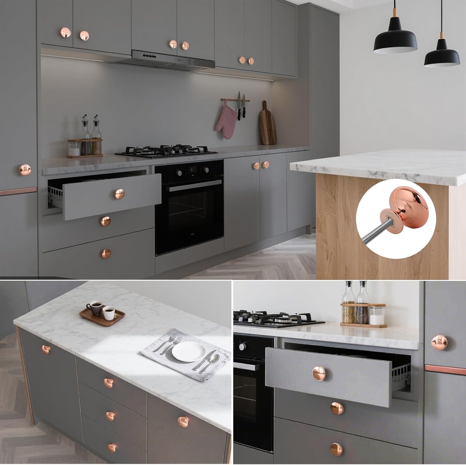 Chraracteristics:Made From premium quality and ideal for most of your projects at home.Durable design& fine touch; An ideal hardware product for kitchen cabinet drawer / door and all rooms The knobs feel smoothly and look shiny in rosegold. It comes with bling style in decorating or refreshing your furnitures like drawer, cabinet, cupboard, wardrobe, dresser, table door, closet etc.Easy to Install: Firstly find the position where you want to install and drill a hole on the board. Then pass through the screw from the back of board, and tighten the knobs from the other side.Specifications: - Knob Diameter: 30mm - Base Diameter: 18mm - Height: 25mm - 22/25/30mm M4 mounting screws included for up to 25 mm Cabinet / Drawer front thicknessPacklist: 4x Round Rosegold Knobs 4x 22mm Screws 4x 25mm Screws 4x 30mm Screws