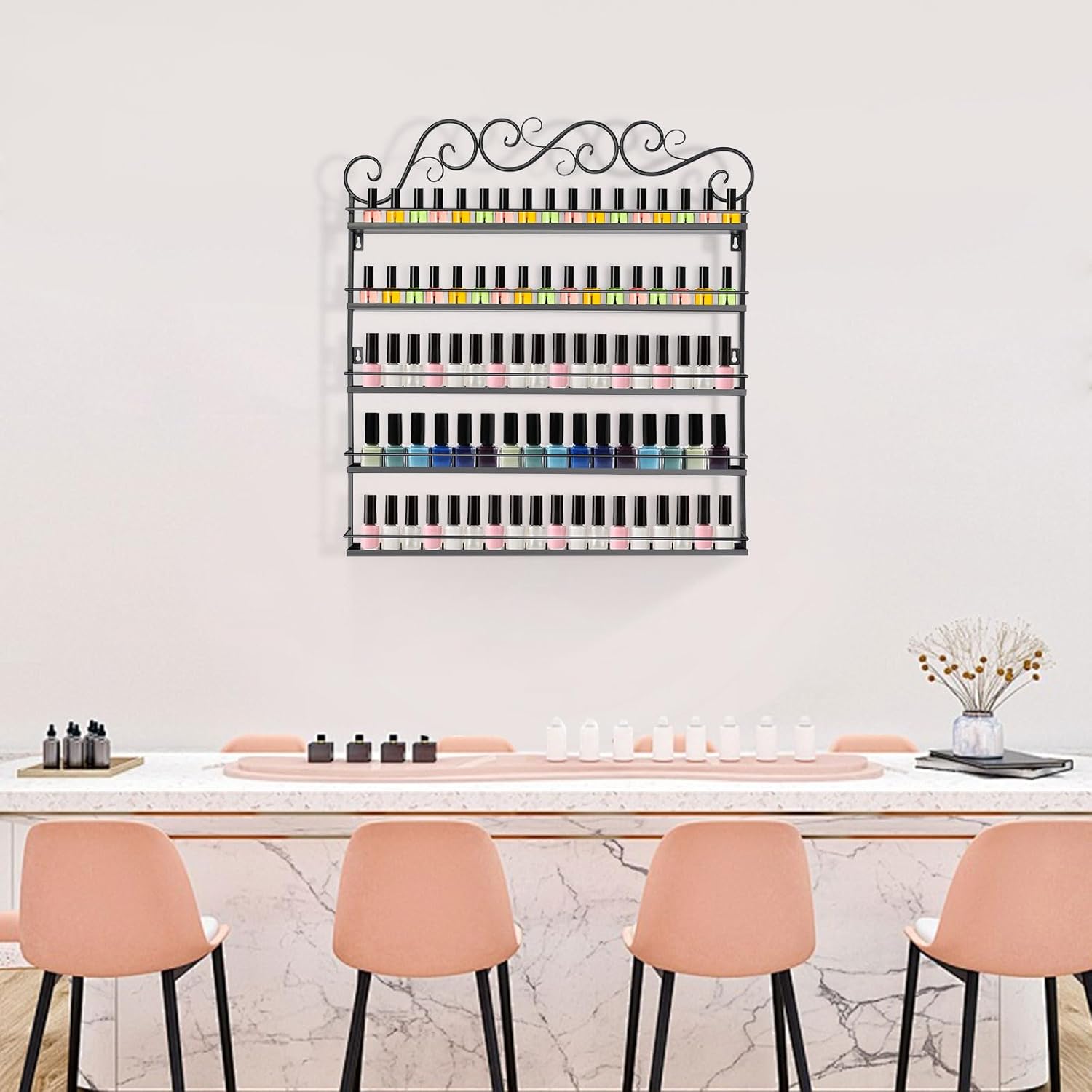 With the increasing standard of living, people's pursuit of beauty is getting higher and higher. This wall-mounted nail polish display rack with a high-temperature baking lacquer process has a good quality package and the European lace elements to enhance the beauty as well as a large space to carry more items. It is good for commercial use for merchants to improve the aesthetics of the store to enhance customer happiness and increase sales. At the same time, it is also a good tool for individuals to store nail polish.Installation1.Measure the position of the hole according to the product size and mark it with a pencil(not included).2.Punch holes at the marked positions.3.Put in the expansion screw bolt.4.Knock the bolt into the hole first.5.Put on the screws.6.Tighten with a screwdriver(not included), and pay attention not all screwed in.7.Hang the product at the screws.8.Before tightening, check if the suspension is secure and complete the installation.SpecificationColor: White/ BlackMaterial: MetalNumber of Tiers: 5Shelf Type: TierShape: RectangularAssembly Required: YesIncluded Components: ScrewsFinish Type: High-Temperature Baking PaintMounting Type: Wall MountNet Weight: 2.3kg/5.07lbsGross Weight: 2.6kg/5.73lbsProduct Size: 66*5.5*70cm/26*2.2*27.55inPackage Size: 68*7.5*72cm/26.8*3.0*28.3inPackage Included1*Nail Polish RackAll Accessories for AssemblyNotes1.This product does not contain nail polish.2.Please do not use it outdoors and avoid long-term exposure to sunlight.3.Please avoid using strong cleaning agents or detergents to wipe the surface and avoid direct contact with high-temperature objects.
