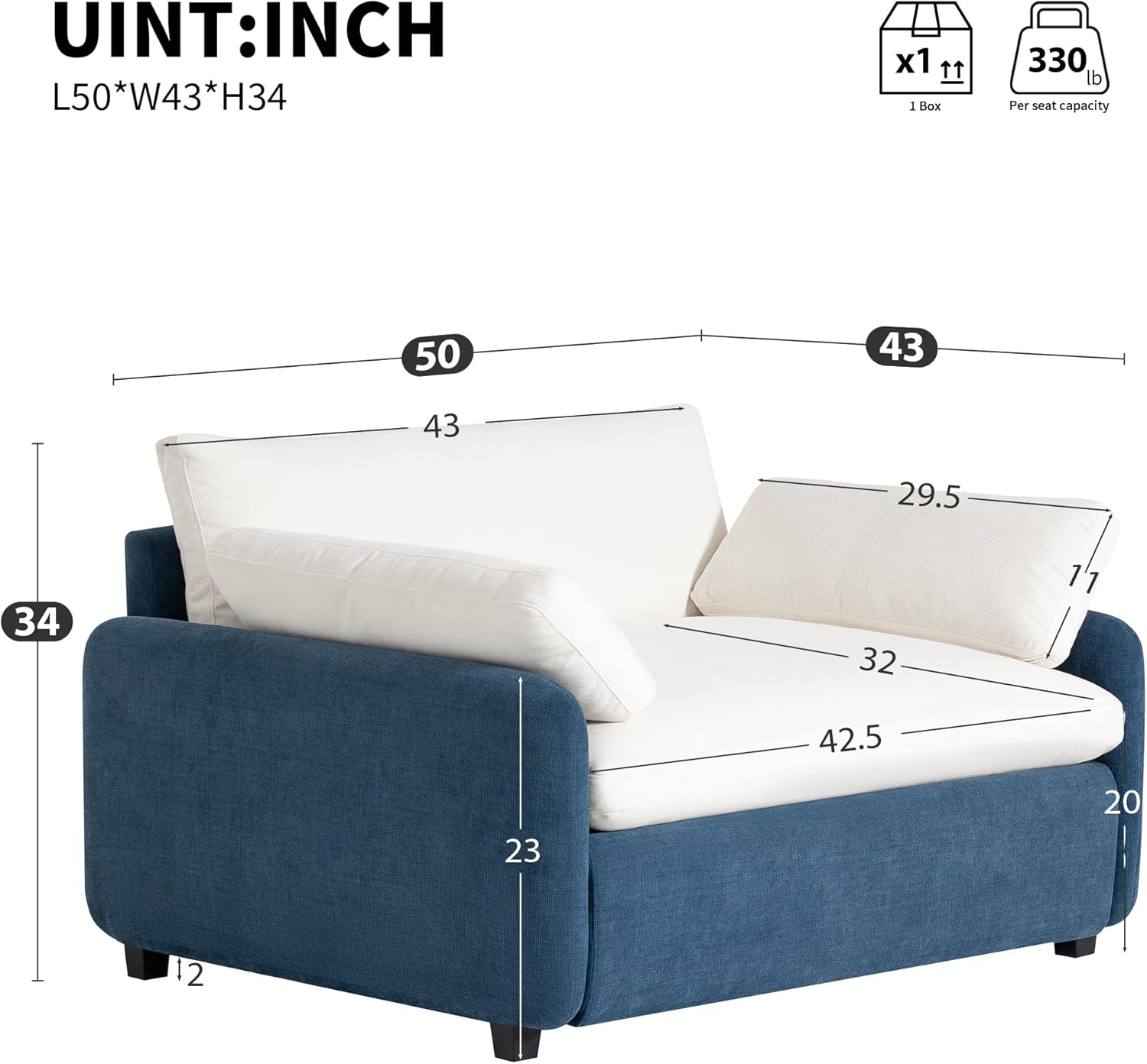 Eafurn Chenille Oversized Armchair, 50” Wide Reading Accent Chair for Adults, Upholstered Mid-Century Modern Lounge Chair for Living Room, Easily AssembledEafurn Color-Blocking Chenille Armchair features a bold, modern design that will be the centerpiece of any room. With an extra-wide 42.5-inch seat and a 32-inch deep seat, you’ll enjoy unparalleled comfort and space to relax. Plus, it comes with two cozy throw pillows for added support and style. FeaturesProduct Type:Chenille Accent Chair Design:Single SofaSeating Capacity:1Upholstery Material:ChenilleFrame Material:Solid + Manufactured WoodLeg Material:PlasticSeat Fill Material:FoamBack Fill Material:FoamRemovable Cushions:YesRemovable Cushion Location:Seat,BackrestRemovable Cushion Cover:NoReversible Cushions:NoPillows Included:Yes,2 IncludedSeat Style:Single cushion seatBack Type:Semi-Attached PillowCountry of Origin:ChinaProduct DimensionsOverall:50*43*34” (L*W*H)Back Height - Seat to Top of Back:16”Arm Height - Floor to Arm:23"Seat Height- Floor to Seat:20"Base Height - Top to Bottom:2"Weight Capacity:330 lbs / seatAdult Assembly Required:YesSuggested # of People:1Additional Tools Required:Tools included