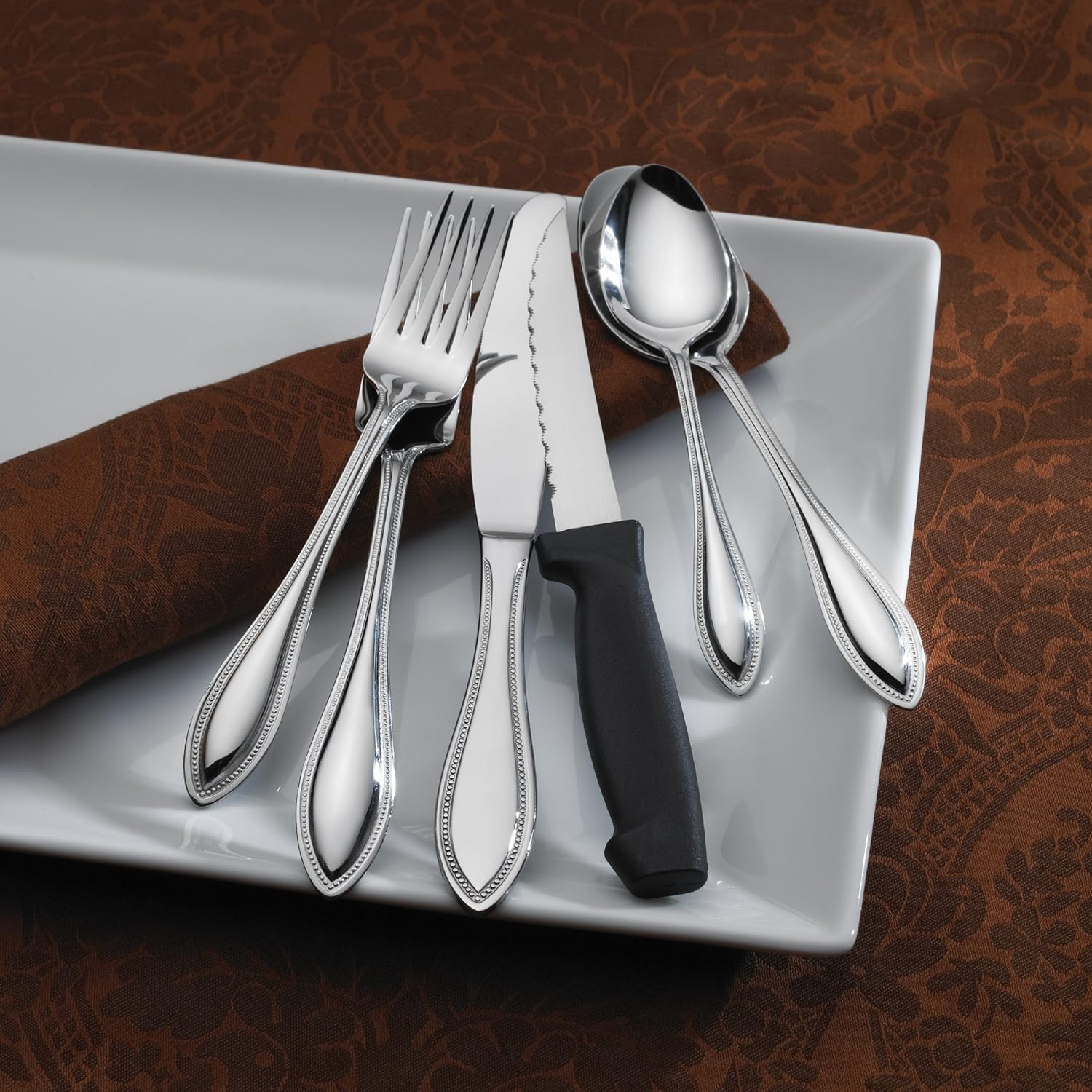 Classic meets modern in this International Silver American Bead Flatware Set. Features a teardrop shape with embossed bead chain border. Expertly crafted from 18/0 stainless steel, this set is designed to complement any tabletop decor. This 53-Piece Set, service for eight, includes (8) each: dinner fork, salad fork, dinner knife, dinner spoon, teaspoon and steak knives, plus a 5 piece Hostess Set, which includes (1) each of: tablespoon, pierced tablespoon, cold meat fork, sugar spoon and butter knife. Dishwasher safe.