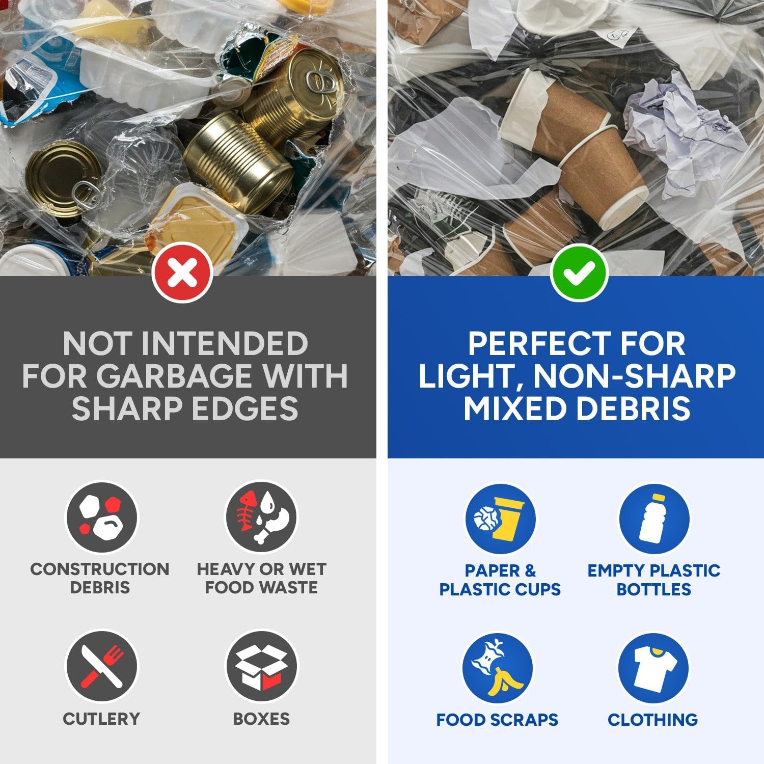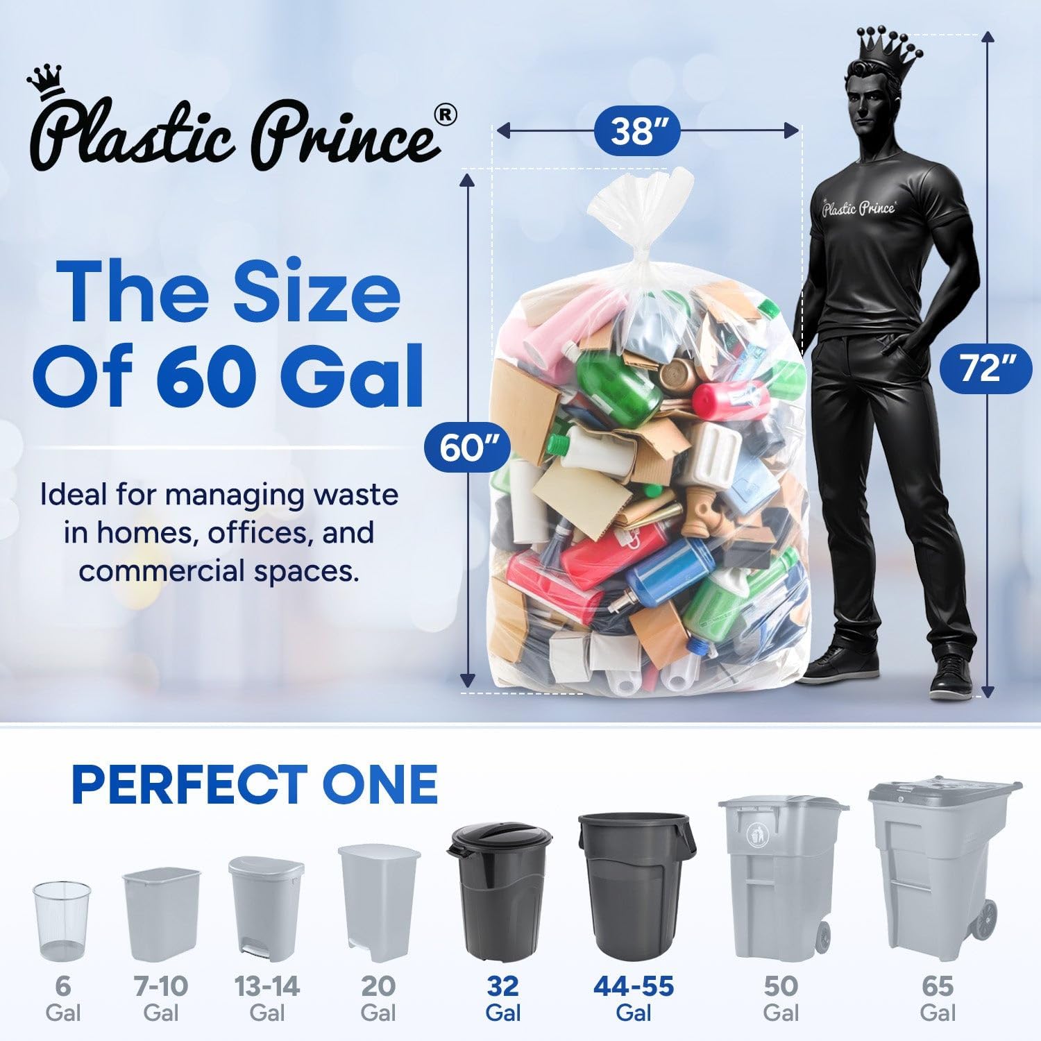 Simplify waste management with our clear high-density can liners designed for 38" x 60" 60-gallon containers. These durable liners feature a 12-micron thickness, ensuring strength and reliability for daily use. Each case contains 200 liners, providing a convenient supply for homes, offices, or commercial spaces.