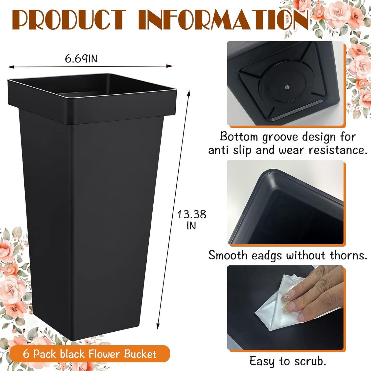Features▪ Ideal for decorating weddings, events, home, office, party table centerpieces▪ Its minimal design and white finish make them match with any occasion.▪ Square bottom provides plenty of balance and stability, suitable for put on any even surface.▪ The containers do not have drainage holes, but you could easily drill through the bottom to create drainage holes for live planting useSpecifications▪ Material: Plastic▪ Shape: Square▪ Color:Black▪ Dimensions: 6.69" Top Diameter, 4.3" Base Diameter, 13.4" Height▪ Package Contents: 6 Plastic Buckets