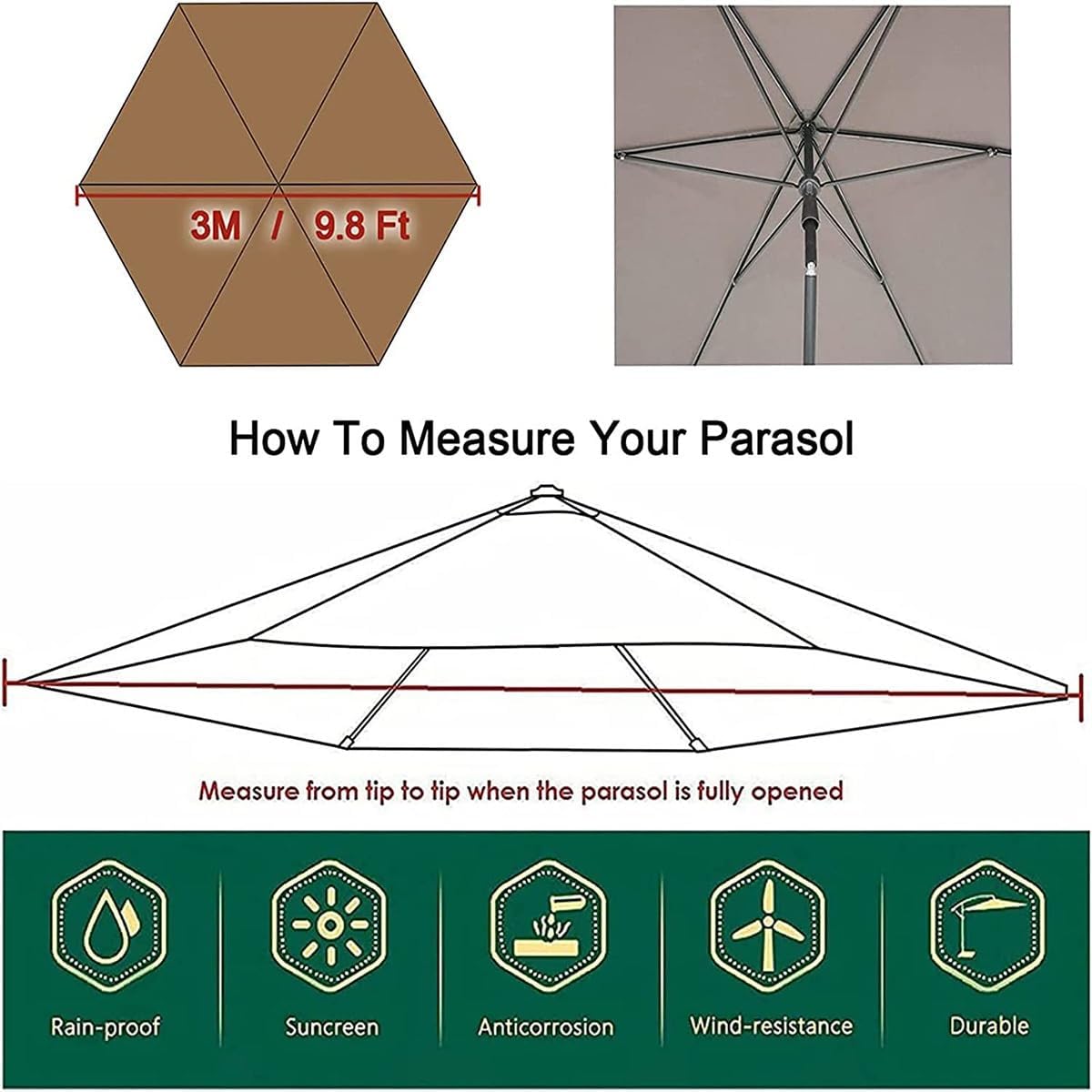 Welcome to our store, I wish you a happy shopping!parasol umbrella coverIf you're frustrated with wind and sun making your awning no longer bright, but it's not economical to just replace an umbrella for a faded parasol, then this parasol fabric is a better choice. Not only does it have many colors to give you more choices, but the quality is also very good. You can upgrade your umbrella for a lot less than buying an umbrella. Make your umbrella beautiful and bring freshness to your life.Specification:Material: PolyesterSize: 2.0m/6.6ft, 2.7m/8.9ft, 3.0m/9.8ftColor: 11 colors availableFits: 6 ribsShipping Contents: 1x Umbrella Coverdescribe:Made of waterproof and anti-corrosion polyester fabric, it can last longer.UV protection and breathable. Protects you from the sun and lets cool breezes blow you by.The simple design makes the canopy easy to carry and take off. Simply place the umbrella poles individually into the pocket at the end of the canopy.Compatible with most common six-rail umbrellas for a wide range of applications.Please note✿✿1. Umbrella poles, poles and end pieces are not included in the scope of delivery✿✿2. Please carefully measure all necessary dimensions of your umbrella before purchasing.✿✿3. Due to the different positions of the picture, the light intensity and other factors, the color may have chromatic aberration, please understand(Thank you for taking the time to consult my products. If you have any needs, please feel free to contact me. We look forward to your visit as always and wish you a happy life)
