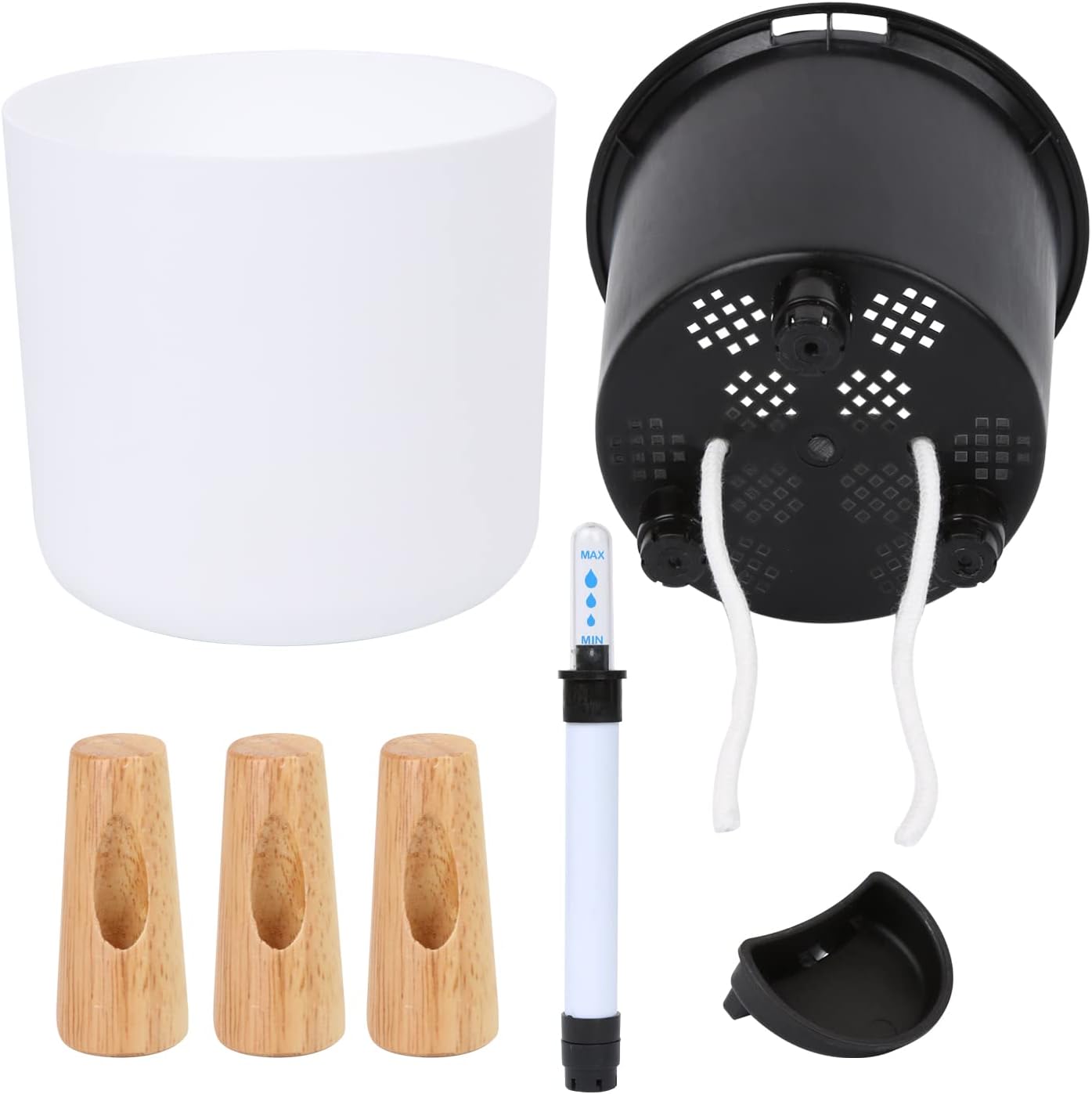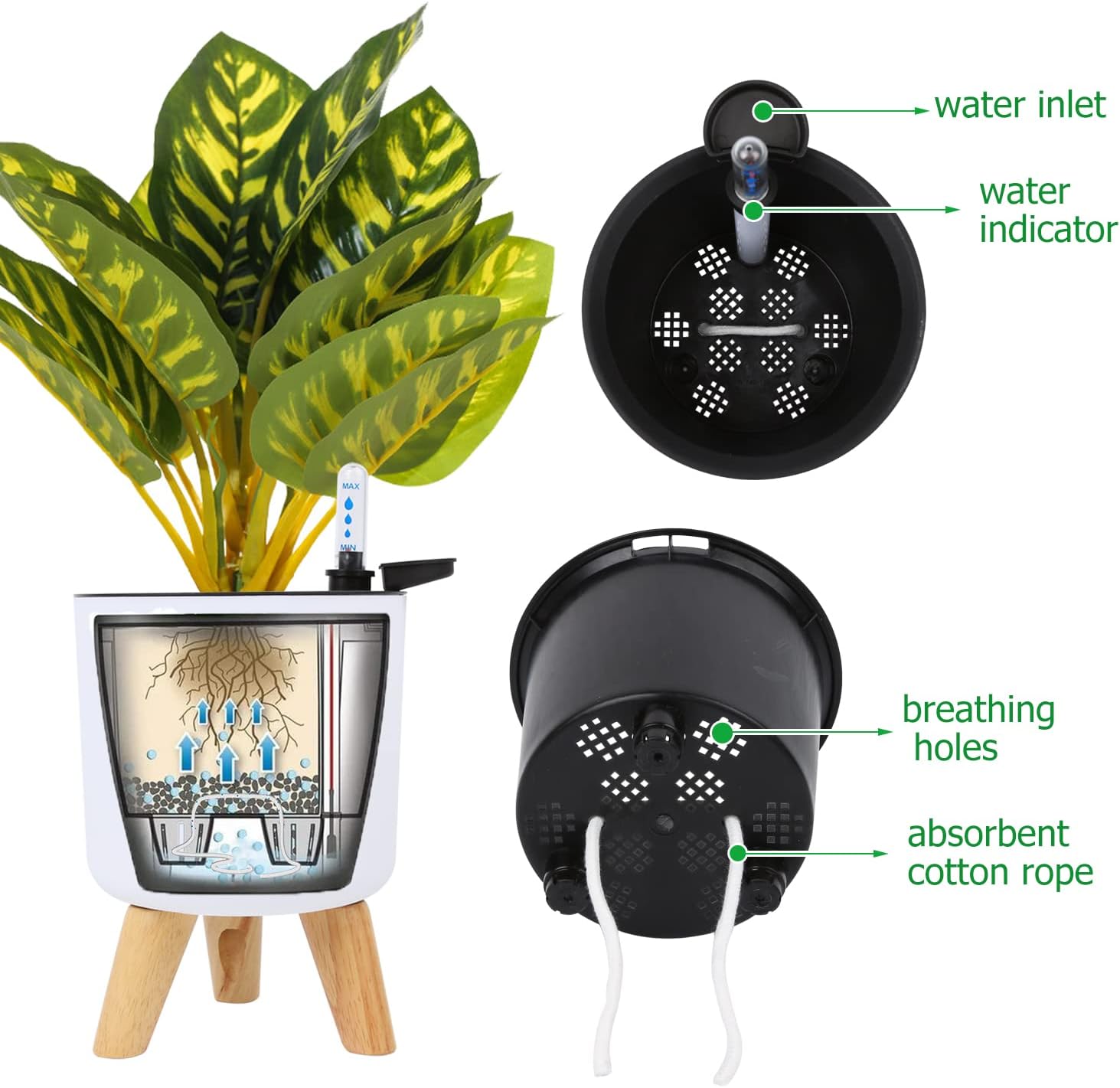 These self-watering pots are suitable for home decoration, Set on any table, counter or desk to bring natural beauty to your home or office, It is a great gift for your friends who love planting. No plant includes in this item! Key Features: [Self-Watering System]: Watering can be reduced to weeks instead of days.[Water Level Indication]: Adequate moisture for your plants' growth.[Ideal Living Environment]: Unique passive hydroponic action creates an ideal balance of root zone oxygen and water.[Ideal Gift Concept]: Perfect gift for your family, your friends as well as the people you care about. Packaging Information: 2 * Planters 2 * full sets of accessories include wood legs, screws, water indicators, water lips, cotton ropes. 1* instructions