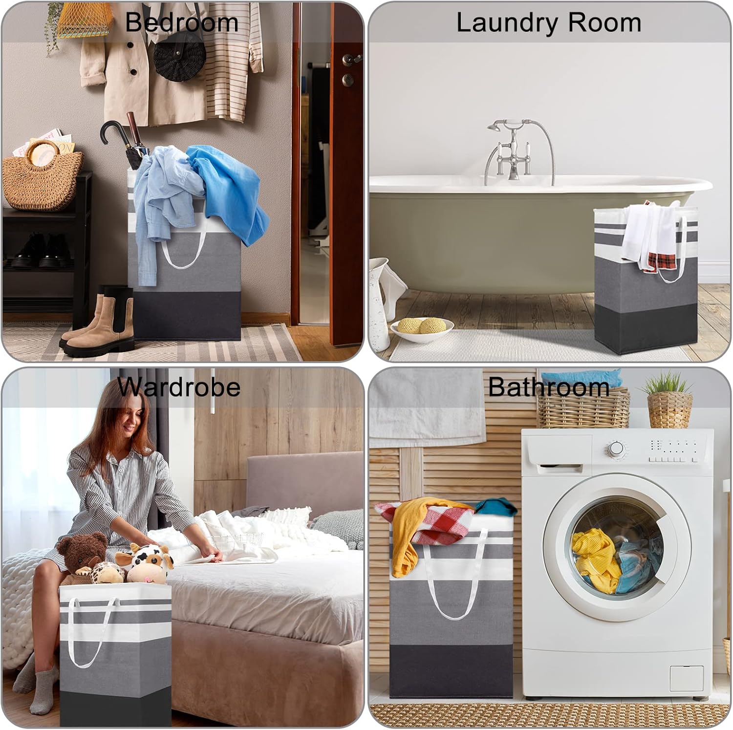 Features: The easy carry laundry basket with handles can be folded into a small size when not in use and makes it convenient for you to store it in drawers, closets and other places, saving much more storage space. These big dirty clothes baskets can bring people lots of conveniences and can be applied as thoughtful gifts for your friends and family, which will help them a lot. Please not use the washing machine to wash the foldable laundry hampers, which will hurt the PE coating. Wipe with a damp cloth or sponge if they are dirty. Specifications: Main material: cotton, linen and PE Color: black, gray and white Size: about 15.7 x 11.8 x 23.8 inches Capacity: about 75 L Package includes: 8 x Collapsible large clothes hampers Notes: Manual measurement, please allow slight errors on size. The colors may exist slight differences due to different screen displays.