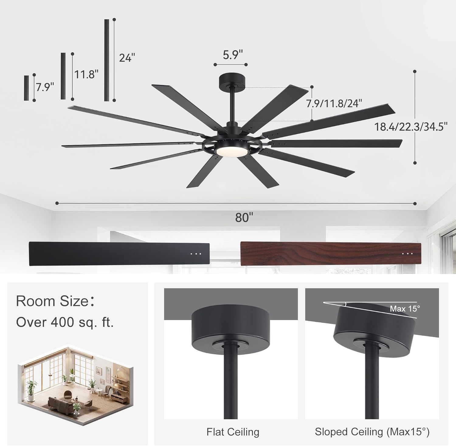 80 Inch Industrial Black Ceiling Fans with Lights Remote Control, Dual-Finish 10 Blades, 3000-6000K Led Light, Reversible DC Motor, 6-Speed, Ceiling Fan for Bedroom Living Room Kitchen Product Features: Fan Type: Down Rod Mount Ceiling Fan Light Style: Industrial/Modern/Farmhouse Material: Metal, ABS Plastic, Acrylic Body Color: Black Number of Blades: 10 Blade Size: 30.9" L x 3.5"W Material of Blades: Plywood Blade Colors: Black/Dark Walnut Blade Pitch: 15 Degree Lighting: LED Light Dimmable: No Motor Type: DC Motor Reversible Motor: Yes Motor Voltage: 110V-120V/60Hz Motor Watts: 70W Speed: 6-Speed Max Motor Speeds: 112 RPM Max CFM: 12000 Down Rod Size Choice: 8"/12"/24" Diameter of the Down Rod: 26.5mm/1 Inch Sloped Ceiling Compatible: Yes. ≤15° Low Noise: Yes Airflow Efficiency: 216 Product Dimensions and Weights: Installer's Choice's two-position mounting system allows for standard or lower mounting. Down Rod (short): 8 inches long Down Rod (long): 12/24 inches long Overall Size: 80 inches diameter x 18.4 inches height (8 in rod) Overall Size: 80 inches diameter x 22.4 inches height (12 in rod) Overall Size: 80 inches diameter x 34.4 inches height (24 in rod) Net Weight: 24.4 lb Package Includes: 1 x 80 inch 10-Blade Black Ceiling Fan Light, 1 x Remote Control, 3 x Down Rods(8", 12", 24"), 1 x User Manual