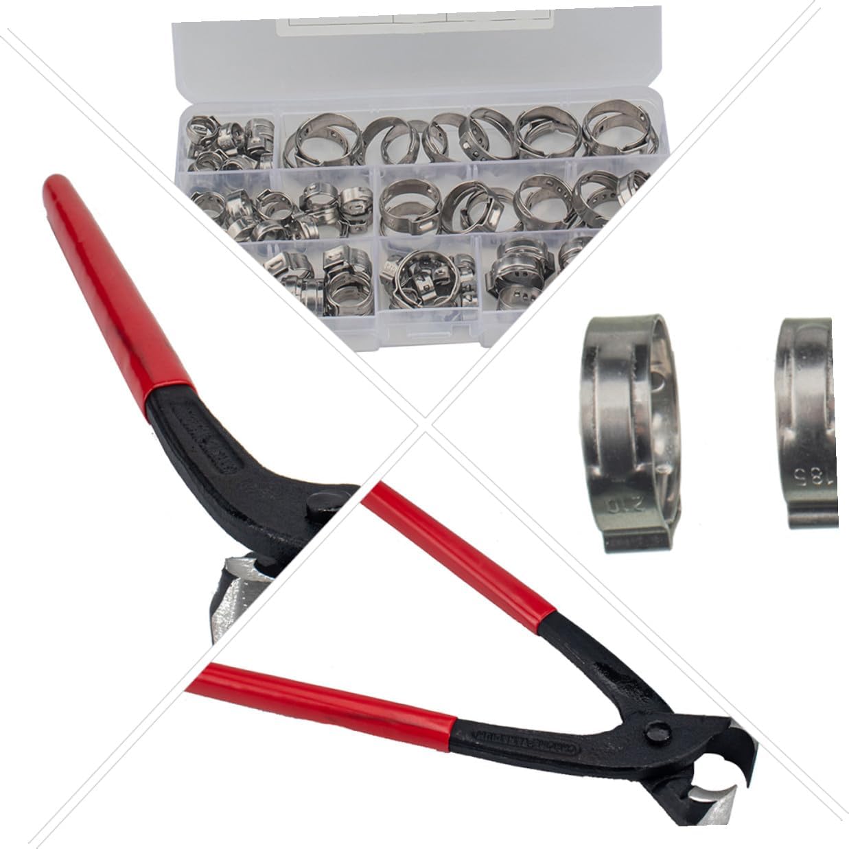 Package Include 10 x 5.8-7.0mm single ear clamp 15 x 7.0-8.7mm single ear clamp 15 x 8.8-10.5mm single ear clamp 10 x 10.8-13.3mm single ear clamp 10 x 12.8-15.3mm single ear clamp 10 x 15.3-18.5mm single ear clamp 10 x 17.8-21mm single ear clamp 1 x ear clamp pincer Features - Color: Silver. -Product Info:Clutch combination - Size: 2.10 x 2.10 x 0.70cm/ 0.83 x 0.83 x 0.28 inch. - Material: Stainless steel. - Without any steps or gaps in the crimp clamp, inner circumference assurance the hose uniform surface compression Kit for Securing Pipe. - The design provides a powerful thermal expansion compensation function, which compensates the dimensional change of the pipe due to temperature changes Hose Clamp. - Crimp hose clamps are made of stainless steel, these clamps are corrosion resistant and anti-rust Stainless Steel Hose Clamp. - So that the pipe is always in a well sealed and fastened state Water Hose Clamps. - Widely used in hoses and plastic pipes, especially suitable for beverage, automotive, marine, motorcycle, and industrial.Goods InformationKit for Securing Pipe design ensures continuous clamping during temperature changes or machine vibrations.Stainless Steel Hose Clamp Narrowband design providing a more concentrated sealing pressure.Hose Fuel Clamps 360 ° design - there is no protrusion and gap in the inner ring.Hose Clamp Packed in a portable plastic box neatly, reducing damage and loss during transportation and storage.Fuel Hose Clamps Made of stainless steel, corrosion resistant and anti-rust.Single Ears Clamp Polished smooth, avoid damage to the hose