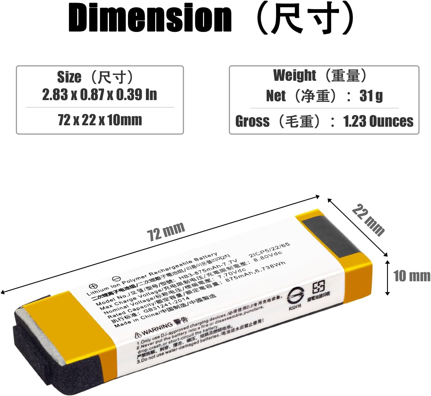 The following is the information of our battery, please check it carefully before purchasing. Part number: DJI HB3 Fit Model: DJI OSMO HB3 Pocket 1 Pocket 2 OT-210 OT110 Caution: 1.Don't disassemble 2.Don't dispose of in fire or water 3. Don't store above 60 ℃(140℉) Your repeat business is important for us, if you have any questions, please feel free to contact us. We promise that we will help you to solve problems. 24 H x 7 D Email Support.