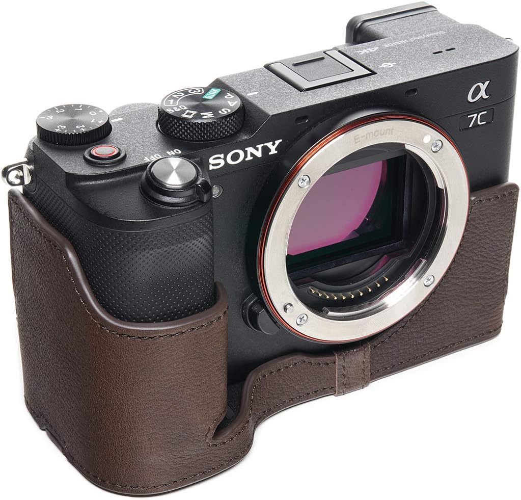 This camera is made by real top layer oil leather, the design is simple and vintage, use Metal sizing techniques make it very fit with the camera body. Inside lining use high lever velvet to protect camera body for scratch and coloration. There is a opening on the bottom for battery, You don't need to take off the half case when you change battery. Under base screw is made by copper and it can easy take off by coin. You don't need to take off the half case when you use tripod. It has a special design for Sony Alpha 7C A7C Camera which makes it easy to turn over the Screen and it will totally not affect screen rotation. You don't need to take off the half case when you connect data lines. Content: 1 x camera half case, 1 x Free Genuine Real Leather Hand Strap, camera not included. Material:Genuine leather.