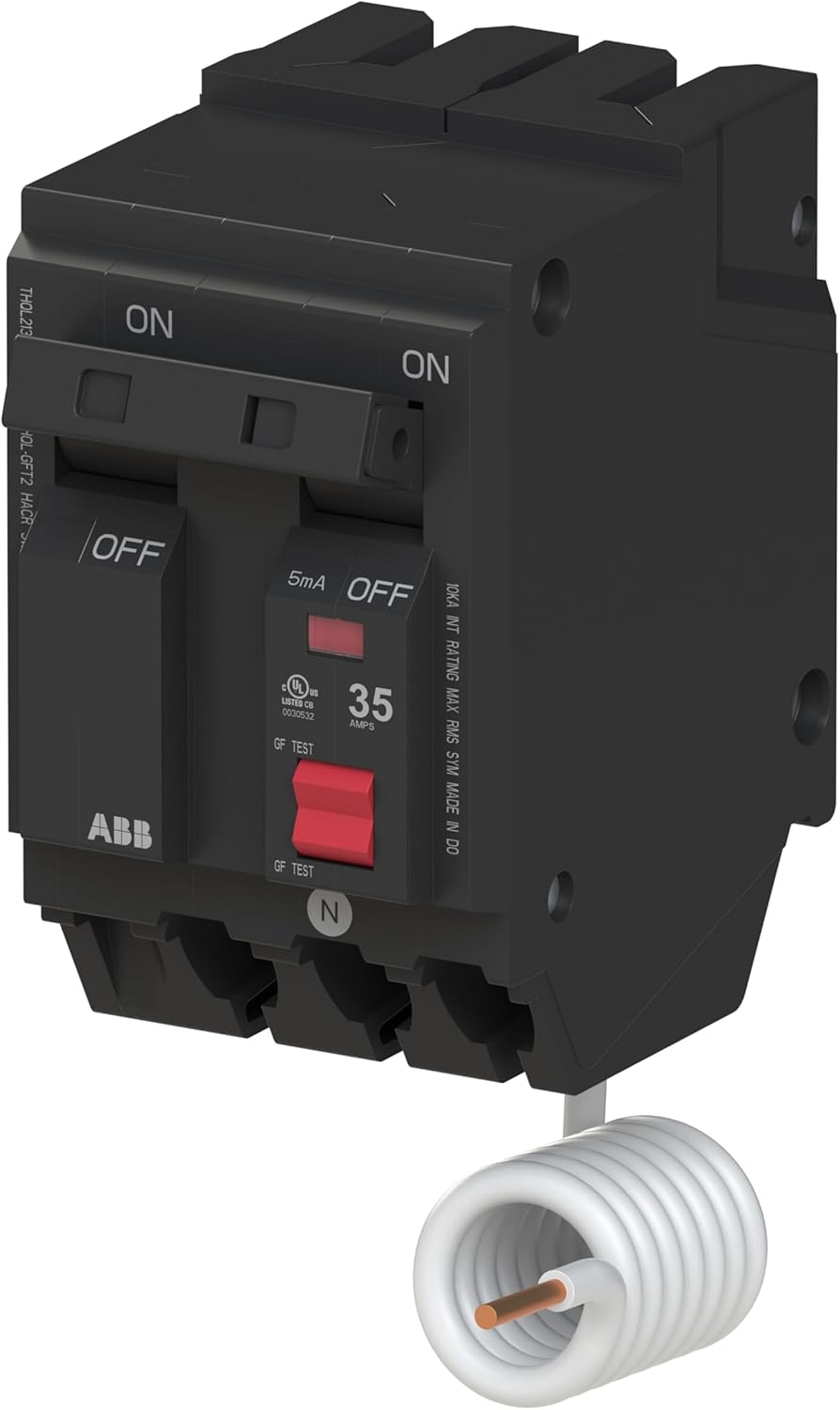 ABB's THQL2135GFT2A is a ground fault circuit breaker (GFCI) designed for residential and commercial applications. It meets NEMA standards, is ANSI certified, and is CSA and UL listed.This double pole, double space, plug-on circuit breaker is rated 35A at 120/240 VAC with a 10 kAIC interrupting rating. The breaker trips to the center position. The tin-plated copper stabs create a corrosion resistant connection. The breaker case is made of heat resistant thermoset for structural integrity.ABB's THQL2135GFT2A replaced GE's THQL2135GFT2 breaker. GE residential electrial products are now branded ABB. ABB is a global leader with over 100 years of electrical expertise, innovation, and pioneering technology.