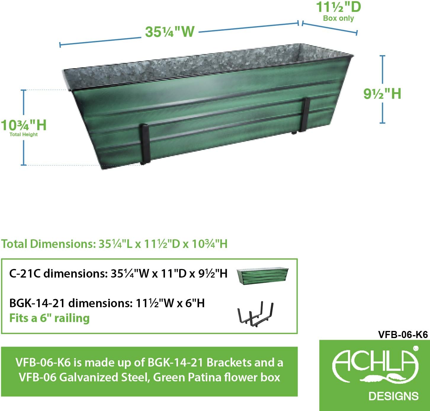 Add curb appeal to a front porch, create a container garden, or decorate with seasonal plantings on a balcony or deck. Our Large Green Flower Box Kit for 2 x 6 Railings has two top-mounted brackets that simply and securely hold our Large Green Galvanized Flower Box planter. For easy installation, place the two wrought iron brackets at the desired width apart and secure with stainless steel screws provided. Fill the box with your choice of planting and place within the brackets. Kits are also available for 2 x 6 inch railings for Medium and Large Flower Boxes, in all four Flower Box colors.