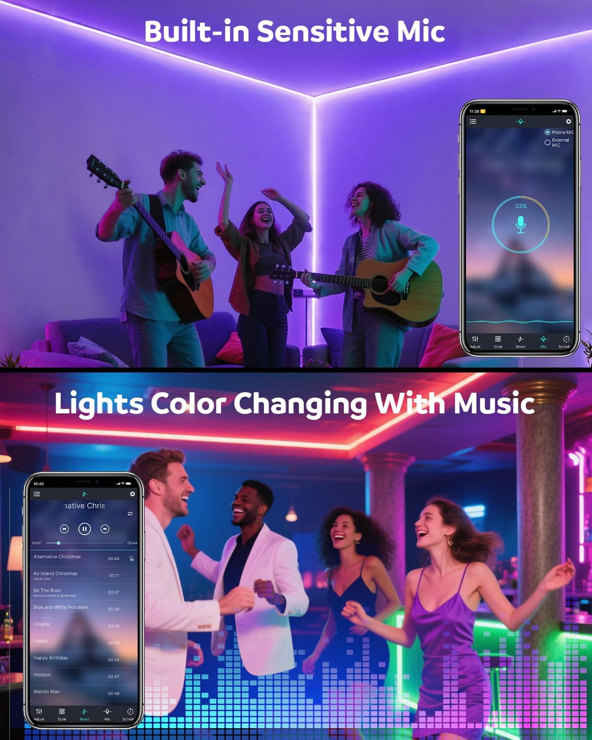 | Additional Features | Color Changing, Dimmable, Music Sync, Waterproof |