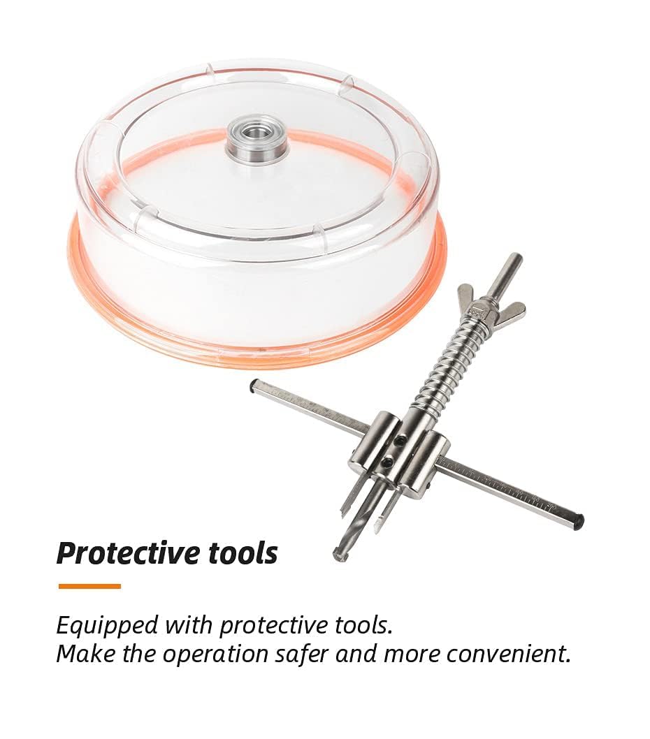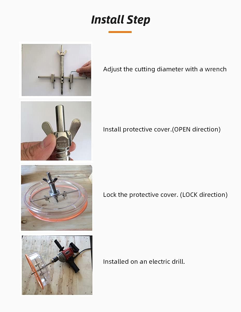 User Instruction It requires a hand drill with a 3/8"(10mm) or larger chuck to cut holes from 1-5/8"(40mm) to 4-7/10""(120mm) in diameter and materials up to 3/4"(19mm) thick from one side, 1-1/8"(30mm) thick from two sides Caution * When cutting into walls, floors or ceilings, always check to ensure that no electric cables or water pipes etc are in the vicinity of the proposed cut * Always keep the cutting blades sharp * Do not use undue force, or too great a drill speed, suggested cutting speeds Hole Diameter(mm) Drill Speed(RPM) 40 - 49 --------------- 800 50 - 69 --------------- 600 70 - 89 --------------- 400 90 - 119 -------------- 200 120 -180 -------------- 100 * Ensure the cutting blade holders are tight before use * Make sure to measure the CUTOUT for the product (speaker, recessed light) you are installing. The size of the product you are installing uses a larger cutout, and the needed size is different by manufacturer of the canned light or the speaker * Screw the wing nut on to the threaded end of the spindle so that that assembly is secure * As with any new tool, always test on a scrap piece of material to get familiar with the tool
