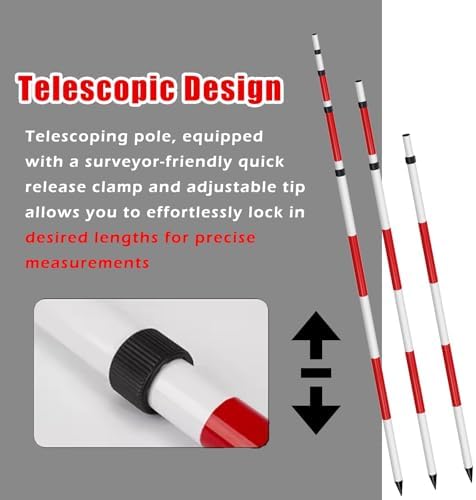 The aluminum surveying rod is designed for optimal visibility with its vibrant red and white color scheme, ensuring easy identification in various lighting conditions. This feature significantly reduces observational errors and enhances safety during fieldwork. Its user-friendly telescoping design allows for quick assembly and compact storage, making it perfect for daily commutes and on-site tasks such as construction layout, foundation surveying, and water depth measurement. Engineered for professionals, this durable tool is ideal for surveyors, engineers, construction workers, and outdoor enthusiasts alike. Made from high-quality aluminum alloy, it is available in lengths of 2m/6.5ft, 3m/9.8ft, and 5m/16.4ft, providing versatile options for different surveying needs. The segmented structure not only offers convenience but also ensures maximum portability. Key features include a metal tip for enhanced stability and precise positioning, making it suitable for a wide range of applications, including construction measurement, road layout, foundation pit monitoring, and river depth measurement. Each package includes one high-visibility survey pole. Be sure to verify your measurements to ensure suitability for your intended purpose. With its reliable design and practical features, this aluminum surveying rod is an essential tool for anyone requiring accurate and efficient surveying solutions.
