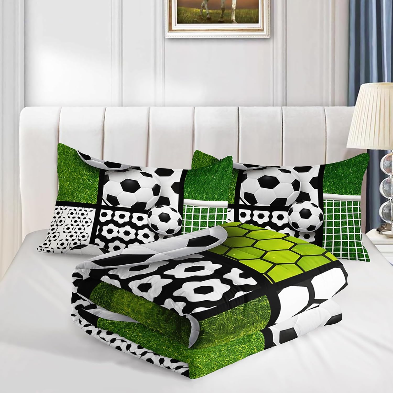 Bring the professional pitch atmosphere into your home with our AILONEN soccer field comforter set. The high-definition printing captures every detail of the green grass. Package Includes: 1 Comforter and 2 Pillowcases. Note: Product arrives vacuum-sealed. Please pat or air out to restore its original fluffy loft.