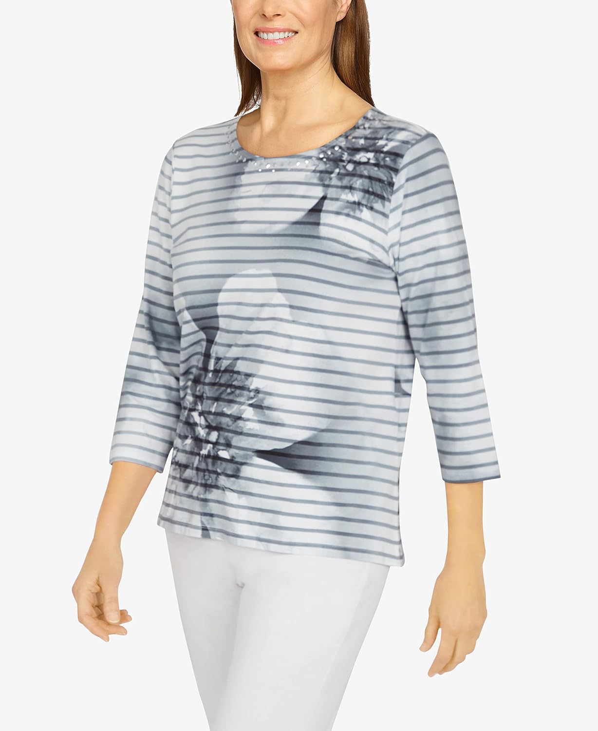Stay ahead of the trend with our floral striped women's top. The pretty embellishments highlight the crewneck on this three-quarter length sleeve style.