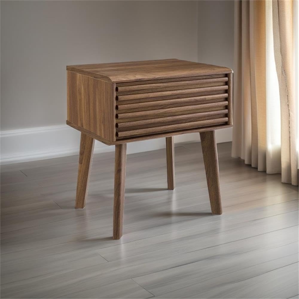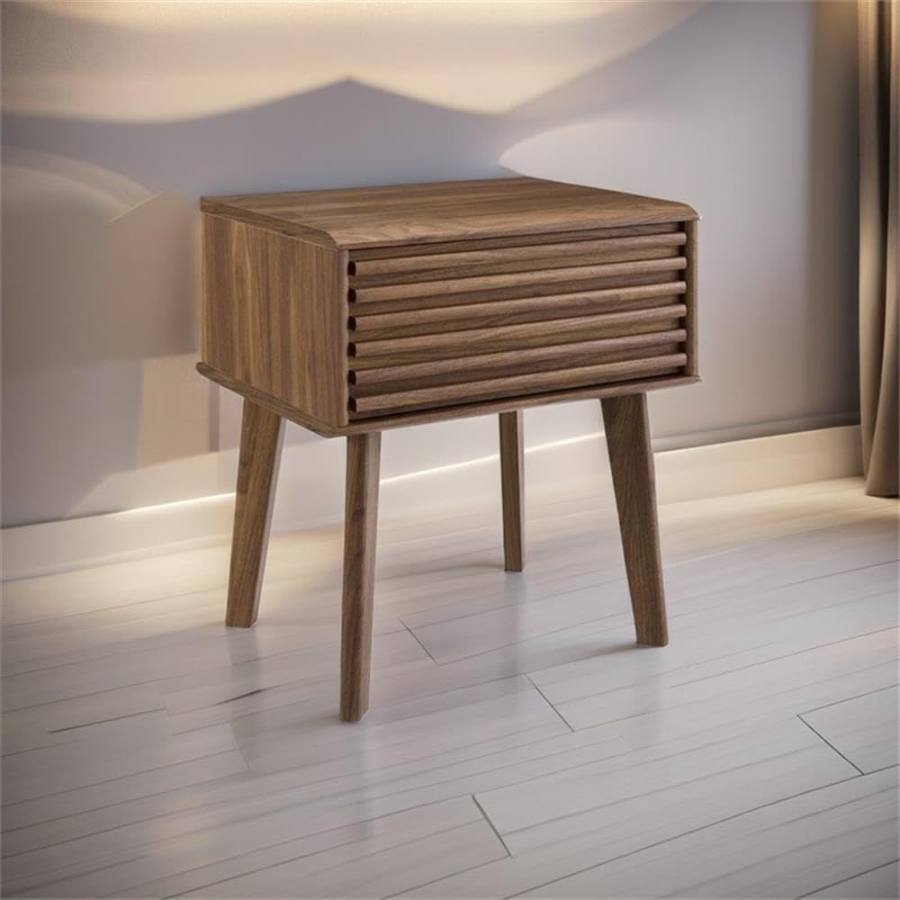 Tap into mid-century aesthetics with this End Table Nightstand. This bedside or living room side table features a durable particleboard frame with smooth walnut grain laminate, four tapered wood legs, and full-extension glide storage drawer. Boasting a mid-century modern style this accent table features a solid construction with a pleasing look and practical functionality.Features:- Mid-Century Nightstand- Accent Table For Entryway- Smooth Wood Grain Laminate- Full-Extension Glide Drawer- Durable Particleboard Construction- Tapered Wood Legs- Assembly RequiredSpecifications:- Product Dimensions: 21.50" H x 15.00" W x 19.00" D- Product Weight: 24 lbs