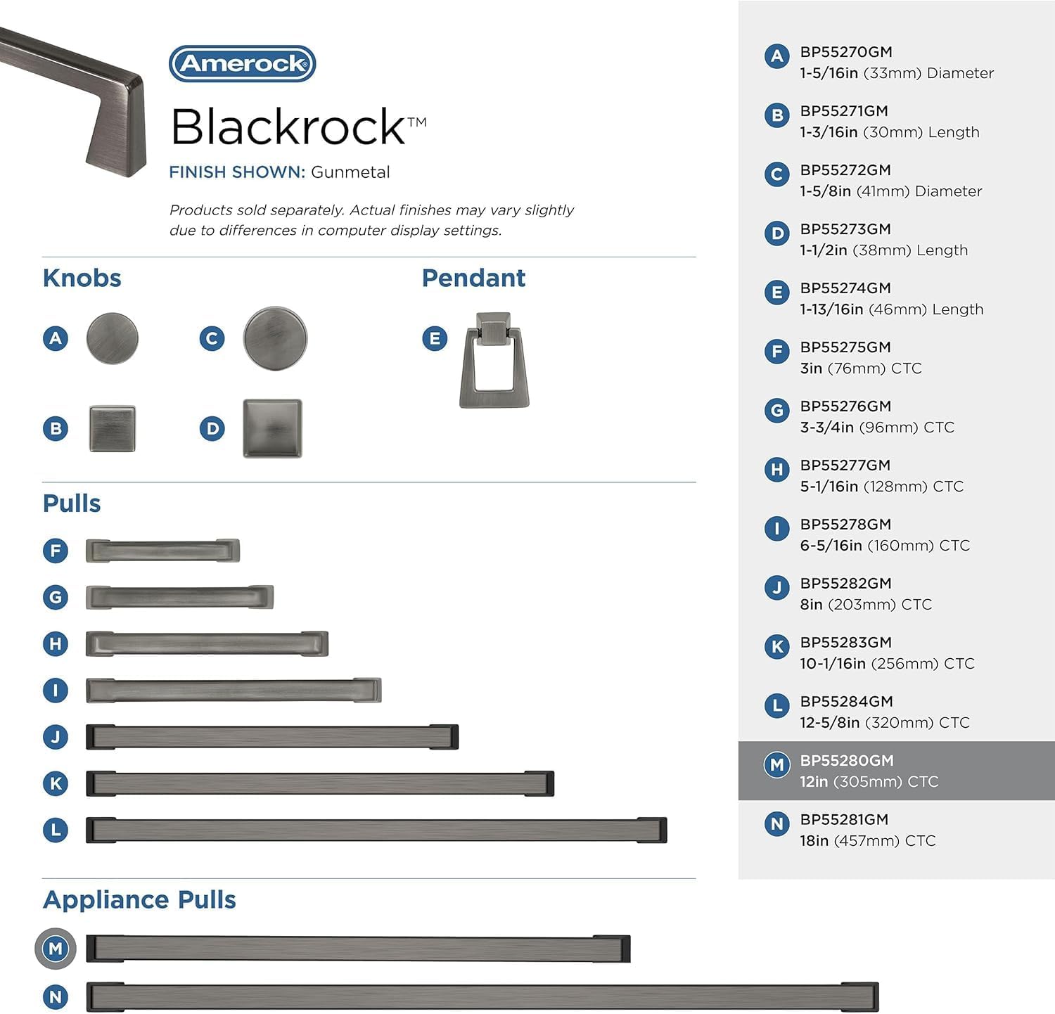 The Amerock BP55280GM Blackrock 12 in (305 mm) Center-to-Center Appliance Pull is finished in Gunmetal. Inspired by hard geometric lines, Blackrock’s simple shapes make a lasting impression. Elegant and eye-catching, Gunmetal is the perfect alternative for those who love metallic, but prefer a hint of subtlety. Use this finish to enhance the modern ambience of stainless steel and Black appliances without overwhelming their natural gravity. Founded in 1928, Amerock’s award-winning home solutions including decorative and functional cabinet hardware, bath accessories, decorative hooks and wall plates have built the company’s reputation for chic design accessories that inspire homeowners to express their personal style. Amerock offers a variety of styles and finishes at affordable prices that add the perfect finishing touch to any room.