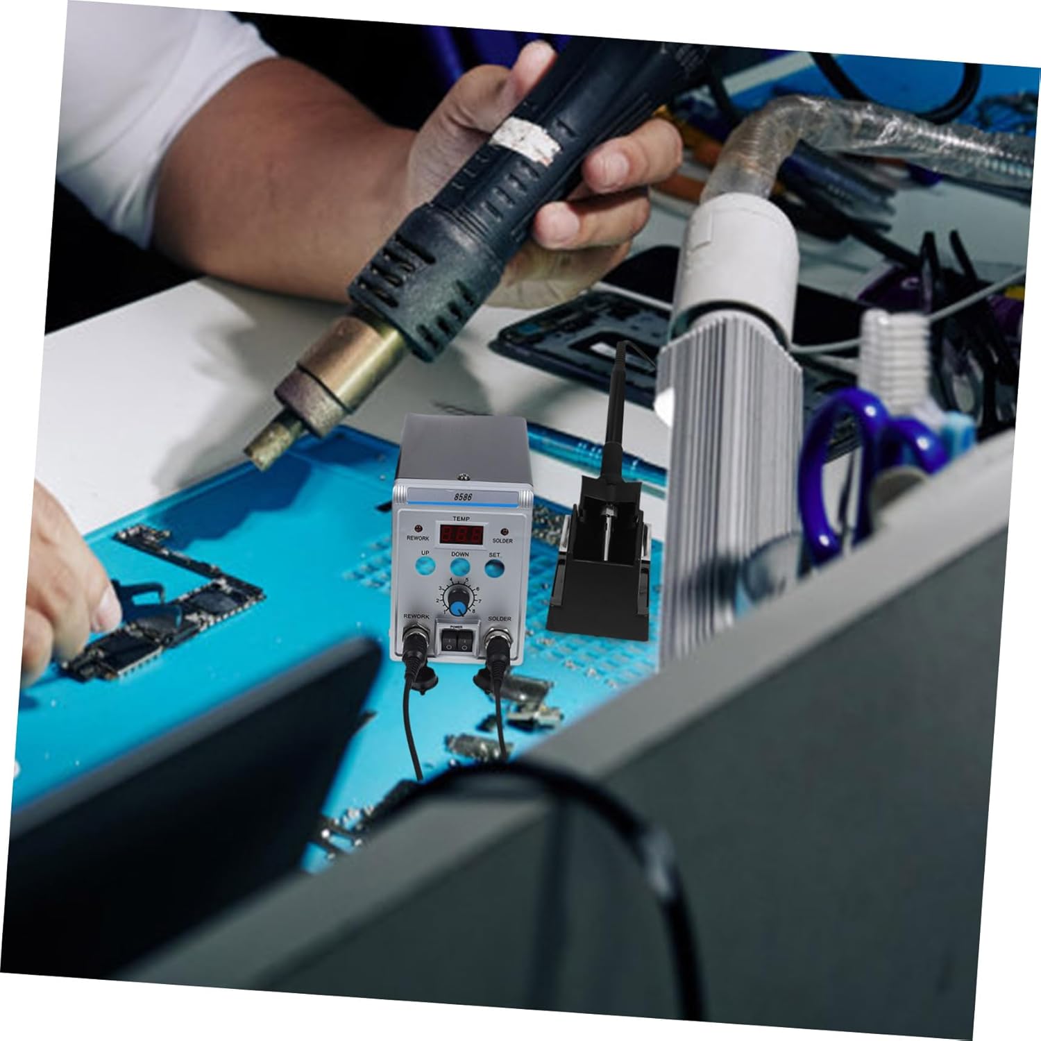 Package Include 1 x set of soldering x nozzle 1 x tweezer 1 x solder sucker Characteristics -Temperature adjustment range: 100-500℃ 200-500℃ hot air rework supplies -Material:ABS,aluminium alloy hot air rework station -Soldering tip to ground resistance: less than Rework Soldering Iron Station -Noise: <45dB useful soldering station -Color:Assorted Color Hot Air Solder station -Size(nozzle):4.50X3.00X2.30cm/1.77X1.18X0.90in Display Soldering Iron Station -Power :700Wmax 60W Rework Soldering Station -Applicable voltage:AC110 hot air soldering station -Size(station):17.00X13.00X9.50cm/6.68X5.11X3.73in Digital Soldering Iron Station -Iron tip to ground resistance: less than 2Ω soldering stations -Size(solder sucker):18.50X2.00X2.00cm/7.27X0.79X0.79in Soldering Iron Station Kit -Air flow rate: 120 L/min DC Power Supply -Size(tweezers):10.50X0.80X0.50cm/4.13X0.31X0.20in practical soldering station -With its combination of features and capabilities, this hot air and soldering station is an essential tool for anyone who needs to perform repairs quickly and efficiently Digital Display soldering stationGoods InformationSoldering Hot Air Rework Station This product is one of for you.Display Soldering Iron Station Note: This item comes with US plug, please confirm the voltage of your area before purchasing.practical soldering station Are you looking for a , yet soldering station ? Are you in search of a sturdy, trustworthy tool that can be used to do multiple jobs at once? , ! Our product must meet your needs