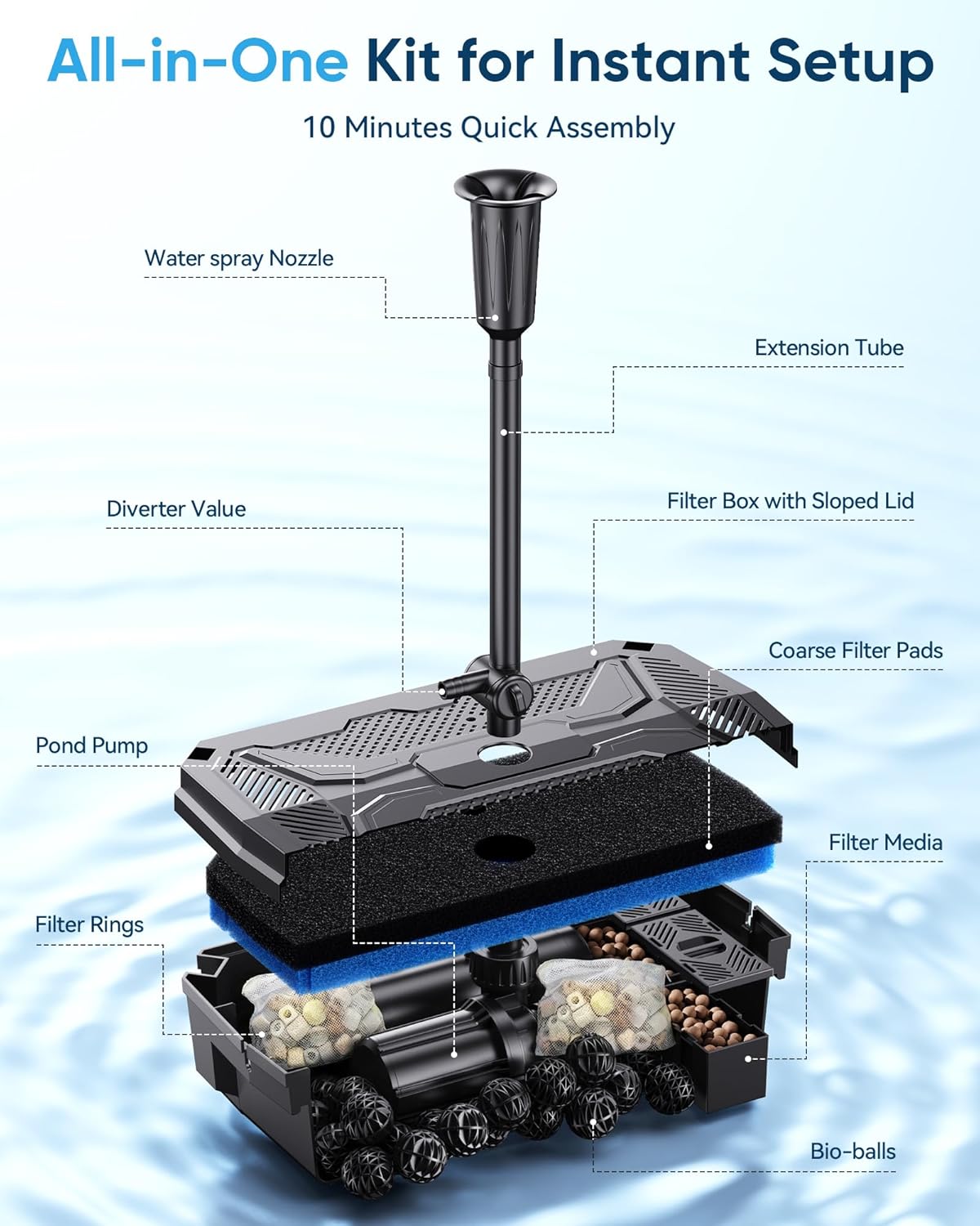 Cloudy Water Solution with 3 Stage Filtration: Our all-in-one pond filter kit combines 3-stage filtration system (coarse filter pads + bio-balls + ceramic media) with dual filtration technology to removes debris, reduces green water, and creates a vibrant, oxygen-rich environment where fish, turtles, and aquatic plants thrive. Say goodbye to clogged pumps and green water with our solar pond filter and pump kit, designed specifically for outdoor ponds to keep your water clean and beautiful all season long.