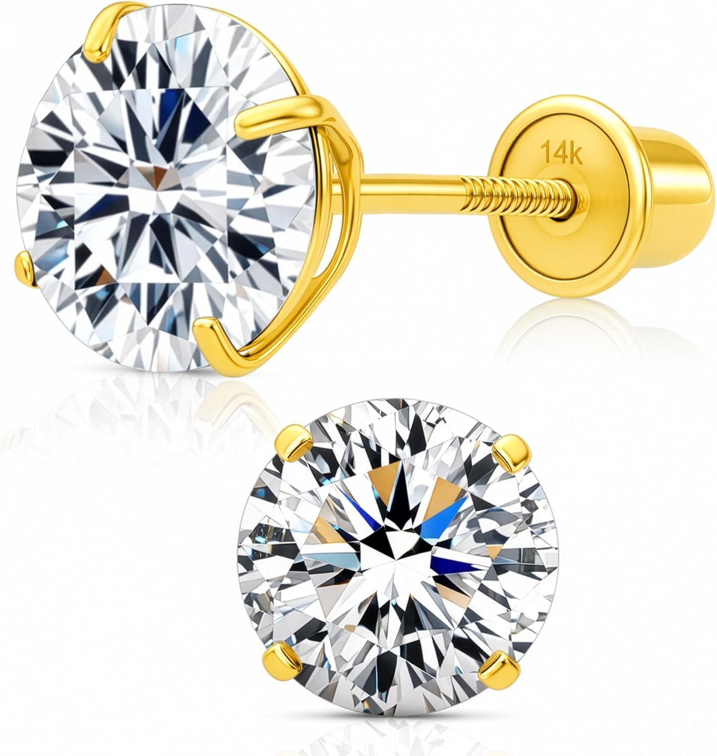 A classic pair of 14k gold stud earrings. Basket four-prong setting style stud earrings offer sophistication and versatility all in one beautiful package. These classic screw-back studs showcase round-cut clear Cubic Zirconia held securely in four-prong settings. The safety screw-backs prevents sharp poking of the post in the back of the ear and offers security to prevent loss of earrings by locking to the end of the post. The earrings are stamped 14K or 585 to guarantees the quality and authenticity.