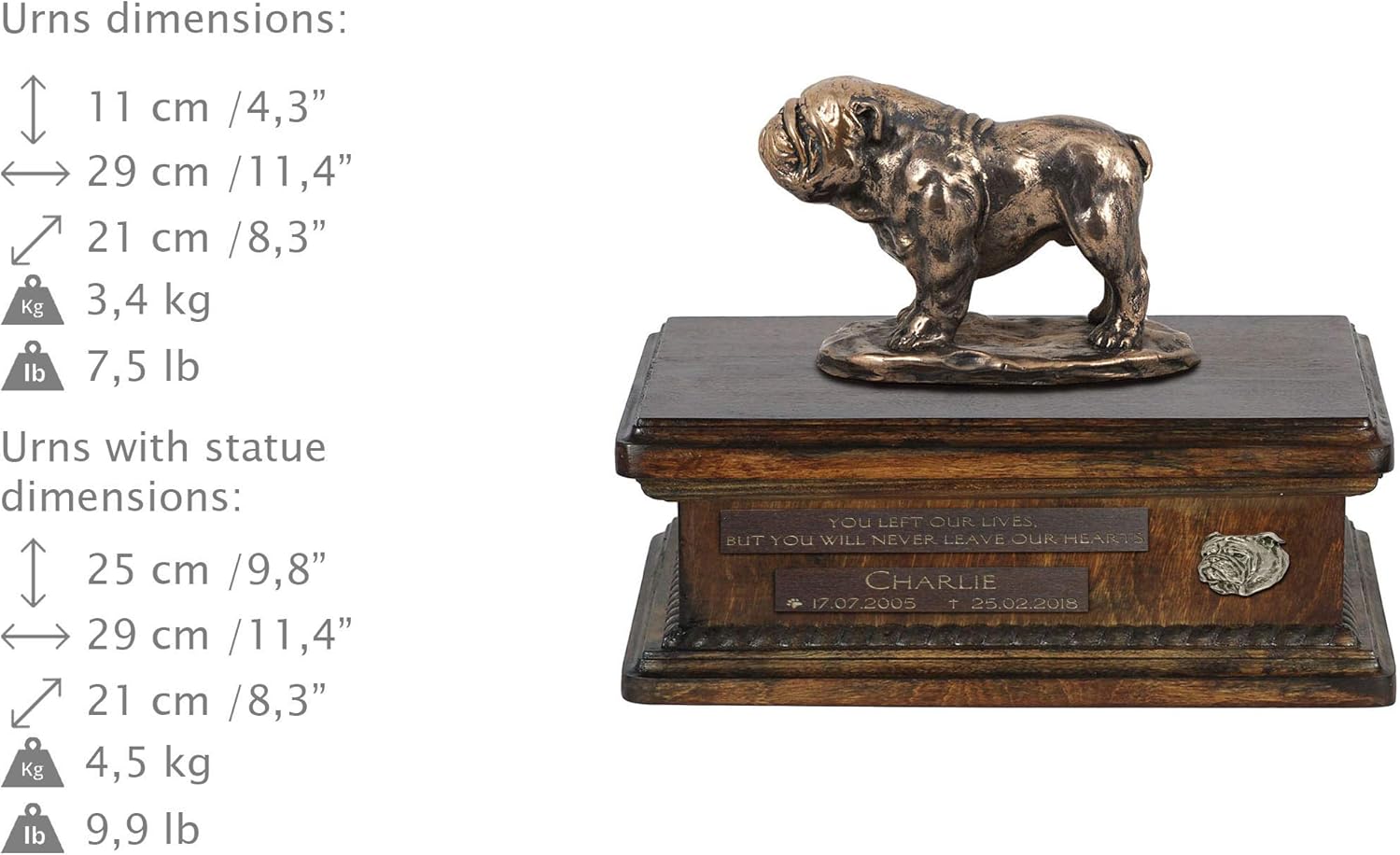 Handmade with precision and care, this cremation box combines artistry with functionality to create a unique and lasting tribute. The Cold Cast Bronze Dog statue, intricately detailed, becomes a focal point of this urn, capturing the spirit and essence of your furry companion. Crafted from durable birch wood, the urn makes for a secure and enduring final resting place. The wooden material adds a touch of warmth and natural beauty, making it a fitting tribute to your pet's memory. Customization is at the core of our Art-Dog Collection, offering a diverse range of statues representing any breed. This allows you to create a personalized memorial that truly reflects the unique qualities of your beloved pet. The wreath-shaped decorations further enhance the urn's aesthetic appeal, adding a subtle yet elegant charm to the overall design. Practicality meets style with the convenient removable lid, ensuring an easy and respectful process for placing your pet's ashes. The urn's dimensions, measuring 21 x 29 x 11 cm, strike a balance between ample space for ashes and a compact size that fits seamlessly into your home. More than just a container, this exclusive Dog Urn by Art-Dog is a meaningful work of art, radiating style and elegance. It stands as a testament to the enduring love and companionship you shared with your pet, creating a memorial that will forever honor their memory.
