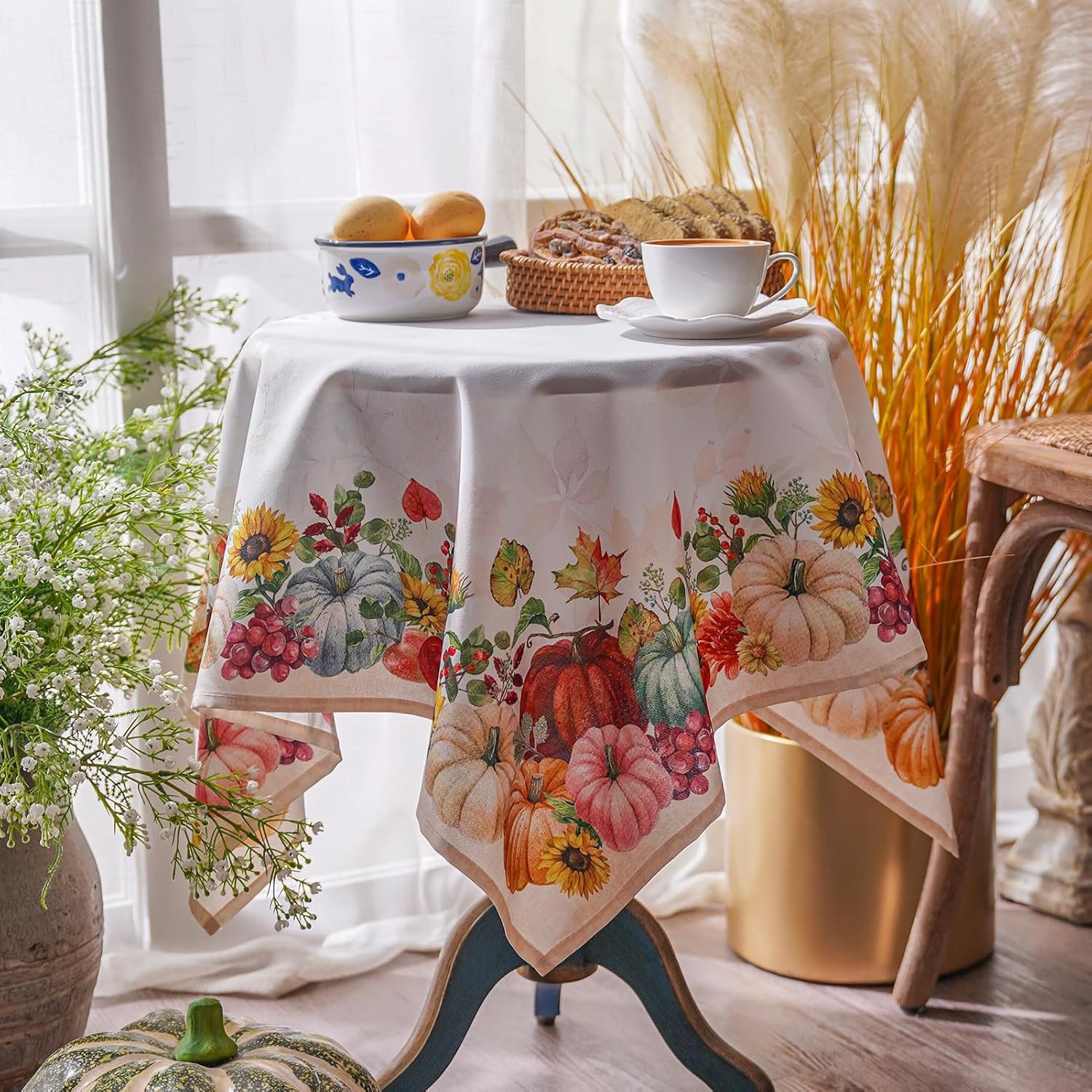 ARTABLE Harvest Festival Fall Printed Tablecloth Autumn Pumpkin Maple Leaves Thanksgiving for Formal Use Home Garden Indoor Outdoor Features · Available Colors: Pumpkin/Maple Leaves · Available Sizes: · Table Runners :33x33’’/52x70’’/60x84’’/ 60x104’’/60x120’’ · Available Shapes: Square/Oblong/Retangle · Material: 100% polyester linen fabric with embroidery rose · Machine washable, No Shrinking, No colour ran, No Wrinkle · 100% polyester fabric with Digital Printing · WIDE USE: You can decorate for any occasion with this autumn tablecloth. Putting it in your dining room anniversary or festival . It can not only dress up a table, but also dress up your feeling