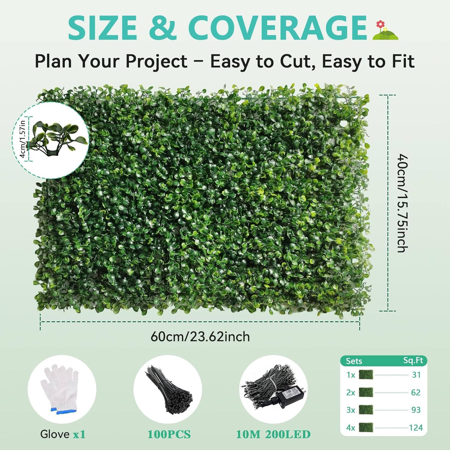 | Included Components | 1 pair of gloves, 100 cable ties, 12pcs grass wall panels, 33ft LED String Light |