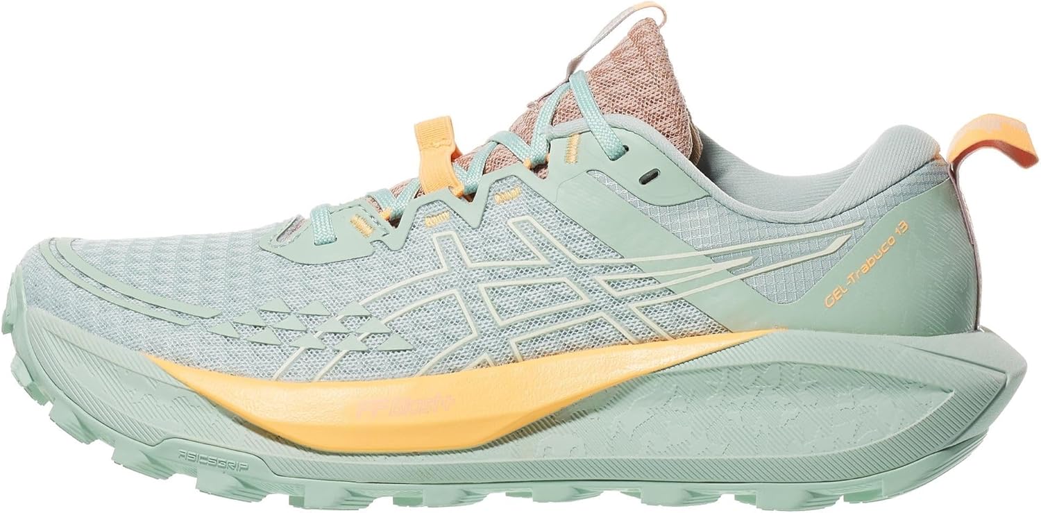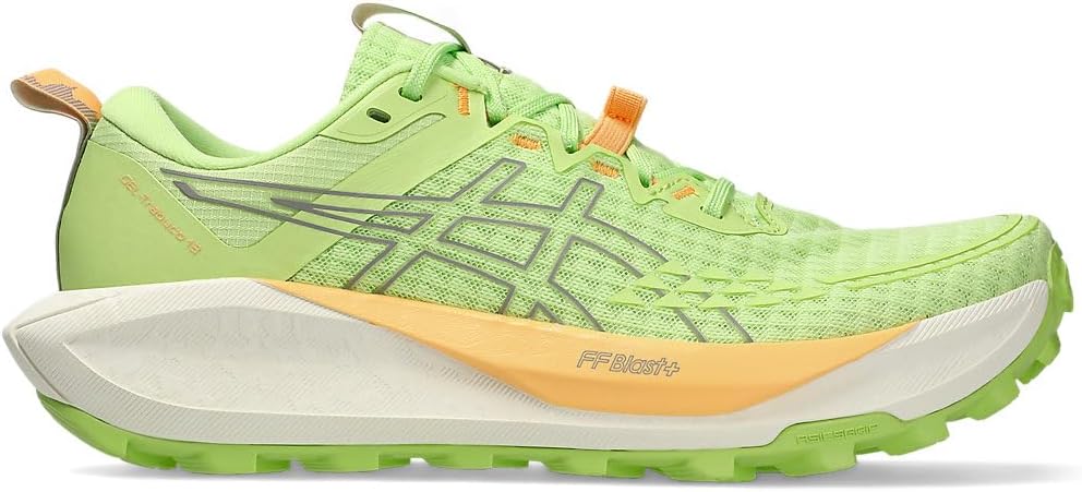 The ASICS GEL-Trabuco 13 shoe is a comfortable design for exploring the trails. A lightweight and energetic cushioning technology is strategically positioned in the midsole, creating a soft feel with advanced impact absorption underfoot. Its rock protection plate features a flexible construction that shields your feet from sharp rocks and rugged terrain. The outsole is formed with a revamped ASICSGRIP technology. This material helps you experience better traction on varying off-road surfaces. Polyester upper and lining. Ethylene vinyl acetate insole. FF BLAST PLUS ECO technology improves impact absorption and creates a softer feeling at footstrike. Sand guard helps prevent debris from entering the shoe's interior. Lace-up closure. Front and back pull tabs for easy wear. Round toe design.