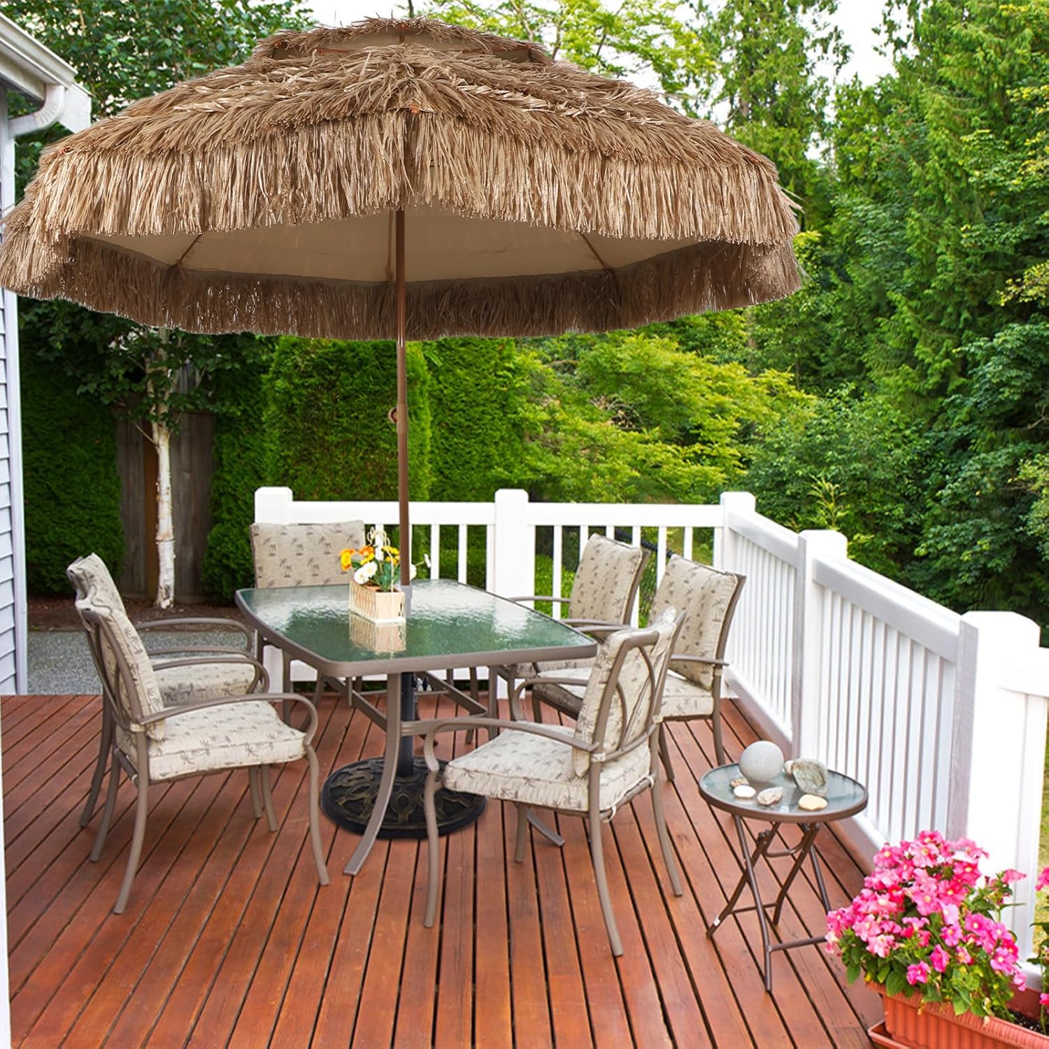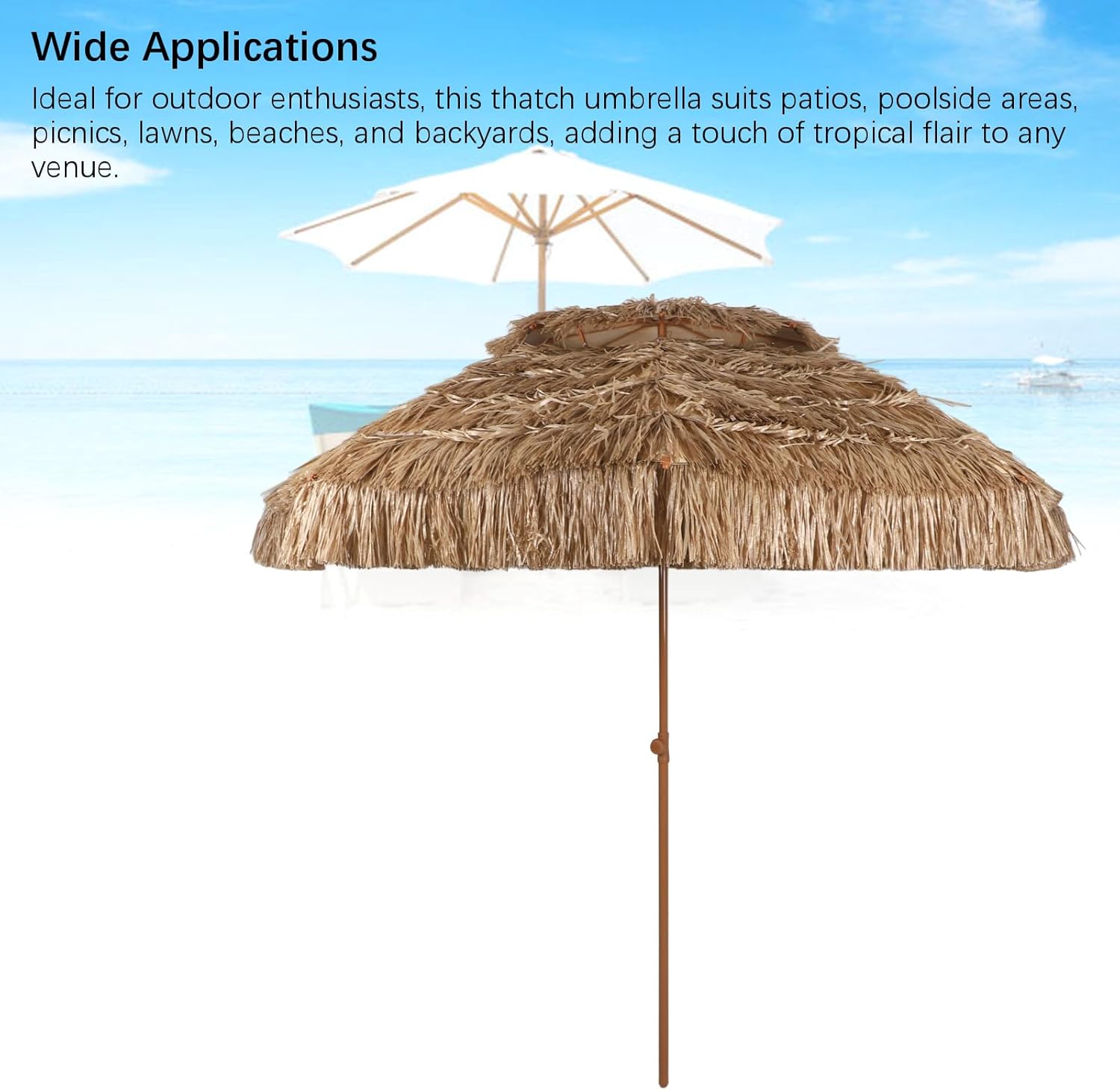 1. Sturdy Frame: For those in windy areas, the umbrella features a steel pole and eight fiberglass ribs, offering enhanced toughness and dependable guard against the weather. 2. Adjustable: Designed for convenience, the standard diameter pole fits most patio tables or bases and includes height adjustment options, making it adaptable to different setups. 3. Premium Sun Guard: Constructed from premium nylon artificial thatch with PP coating material, UPF 50+, it provides effective sun exposure prevention, ideal for keeping you cool and shaded. 4. Portable and Space Saving: The umbrella's foldable design allows for efficient disassembly and quick storage in a storage bag, ensuring it doesn't clutter your space. 5. Wide Applications: Ideal for outdoor enthusiasts, this thatch umbrella suits patios, poolside areas, picnics, lawns, beaches, and backyards, adding a touch of tropical flair to any venue. Spec: Item Type: Thatch Umbrella Material: Glass Fiber, PE, Polyester Weight: Approx. 6500g / 229.3oz Arc Length: 2.8m / 9.2ft Diameter Under Umbrella: 2.4m / 7.9ft Total Height: 2.7m / 8.9ft Bead to Ground: 2.06m / 6.8ft Grass Curtain to Ground: 1.86m / 6.1ft How to Use: Use it directly. Package List: 1 x Thatch Umbrella 1 x Central Pole 1 x Storage Bag