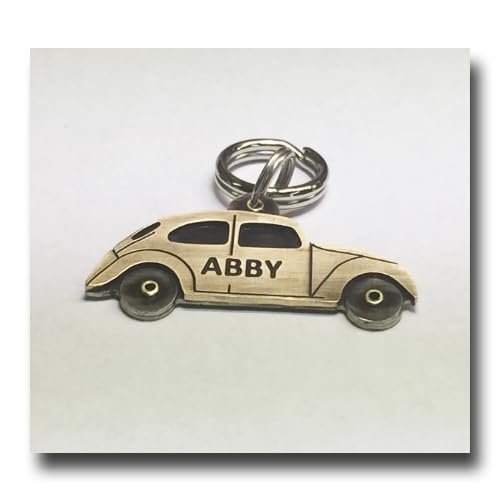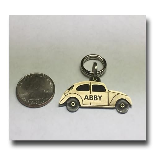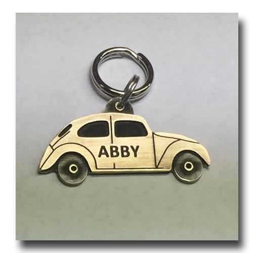 Auto automobile Car VW Beetle Bug Dog Pet ID- Collar Tag. This is a unique pet tag in the shape of a car. I've designed it with multi layers. Nickel silver back, brass front with cut out windows, nickel silver tires with brass rivets for hubcaps. This dog id tag measures 1 3/4" across by approximately 3/4" tall not including the tab at the top of the car (just the car itself). Custom stamped with your pet's name on the front and a phone number on the back.