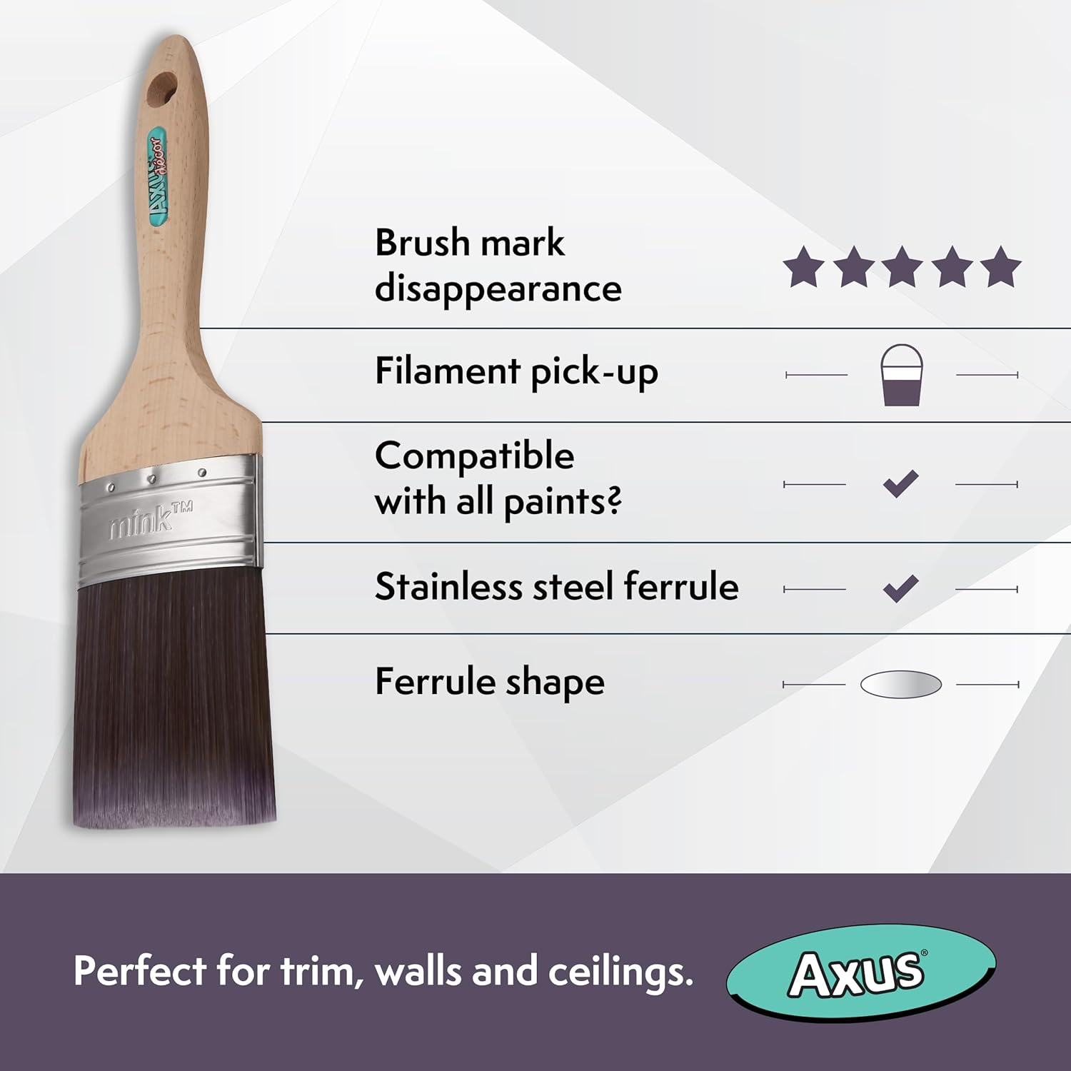 A slightly oval shaped brush that offers exceptional performance with all types of paints The ultra-fine Silk Touch filaments eliminate more brush marks than traditional brushes The Stainless steel ferrule makes it compatible with your brush storage box Ergonomic beech wood handle from responsible managed forests