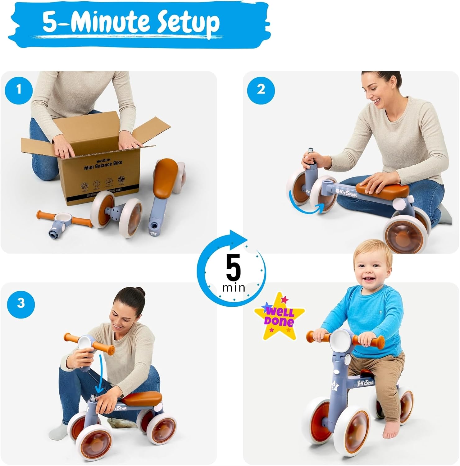 Before, your toddler wanted a “first bike,” but the ride-on felt wobbly or didn’t fit. Frustration hit when turns got jerky and play stopped fast. Then you discover a balance bike that adjusts. After, they glide with calm, bright confidence—indoors or outside. ✓ Adjustable fit that grows with them: This toddler balance bike lets you set handlebar angle and rear wheel angle in 3 positions each, helping kids 12–36 months find a comfy, steady posture for early balance and coordination. ✓ Stable beginner control: A 4-wheel baby balance bike design plus a 135° steering limiter helps reduce over-steering, so new riders feel more secure while they practice without pedals. ✓ Light-up fun with no batteries: 7-inch EVA wheels light up when moving, adding colorful lighting you can see as they roll—no battery swaps, just more smiles. ✓ Fast setup for busy days: Your toddler bike assembles in 3 steps with no tools in about 5 minutes, so it’s ready for a birthday gift moment or a quick after-dinner ride. ✓ Lightweight, indoor/outdoor ready: At only 4.4 lbs, this riding toy is easy to carry and store; EVA wheels feel smooth and quieter on many floors, making it a practical outdoor toy and indoor hallway favorite. Perfect for parents, grandparents, and caregivers shopping for toddlers 1–3 who want a starter bike that won’t overwhelm new walkers. Use it in an apartment, on hardwood floors, or on the driveway—watch them push, steer, and cruise with a proud little grin. CPSIA & ASTM certified and backed by a 3-year warranty. Skip it, and you may keep dealing with cramped fit or unstable rides that end in tears. Choose bicystar today and get them rolling toward independence—joy.