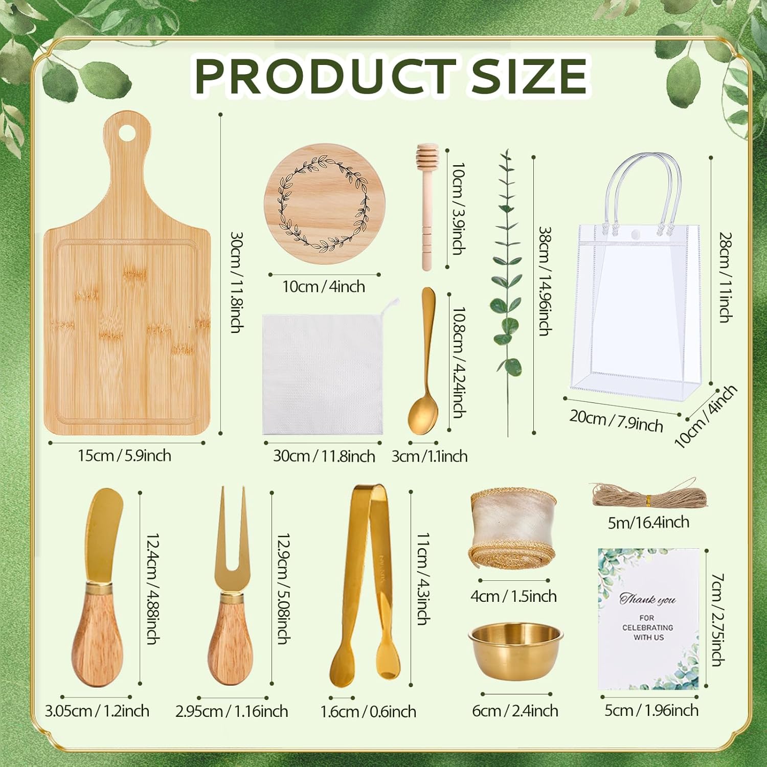Elevate your baby shower, bridal shower, or wedding celebrations with this comprehensive 15-piece prize package.Each set includes elegantly designed cheese boards paired with matching butter spreaders, creating perfect party favors for game winners. The baby shower prizes contain 1 complete sets featuring stainless steel utensils, cheese boards, honey dippers, spoons, forks, knives, decorative towels, thank you cards, and gift bags – everything needed to make your special event memorable. The thoughtfully curated sets include gift bags, making prize distribution effortless during party games and ensuring storage and transport are simple. These versatile party favors combine practicality with style, offering winners useful items they'll enjoy long after the celebration. Package Including:1 Pcs Square Shaped Cheese Boards1 Pcs Forks1 Pcs Spoons1 Pcs Honey Dippers1 Pcs Butter Spreaders1 Pcs Mini Serving Tongs1 Pcs Golden Stainless Steel Dipping Bowls1 Pcs Coasters1 Pcs Plaid Towels2 Pcs Artificial Eucalyptus Stems1 Pcs Charming "Thank You" Cards1 Pcs Gift Bags1 Pc A Roll of Ribbon1 Pc Hemp RopeWhy Choose Our Party Favor Set?✓ Complete 15-piece set – everything you need for memorable party favors✓ Perfect for baby showers, bridal showers, weddings, and other special events✓ Elegantly designed pieces that combine practicality with style✓ Thoughtfully curated sets including gift bags for effortless prize distribution✓ High-quality materials that guests will enjoy long after the celebration✓ Beautiful presentation with decorative elements like eucalyptus stems✓ Includes thank you cards for a personal touch✓ Convenient storage and transport with included gift bags