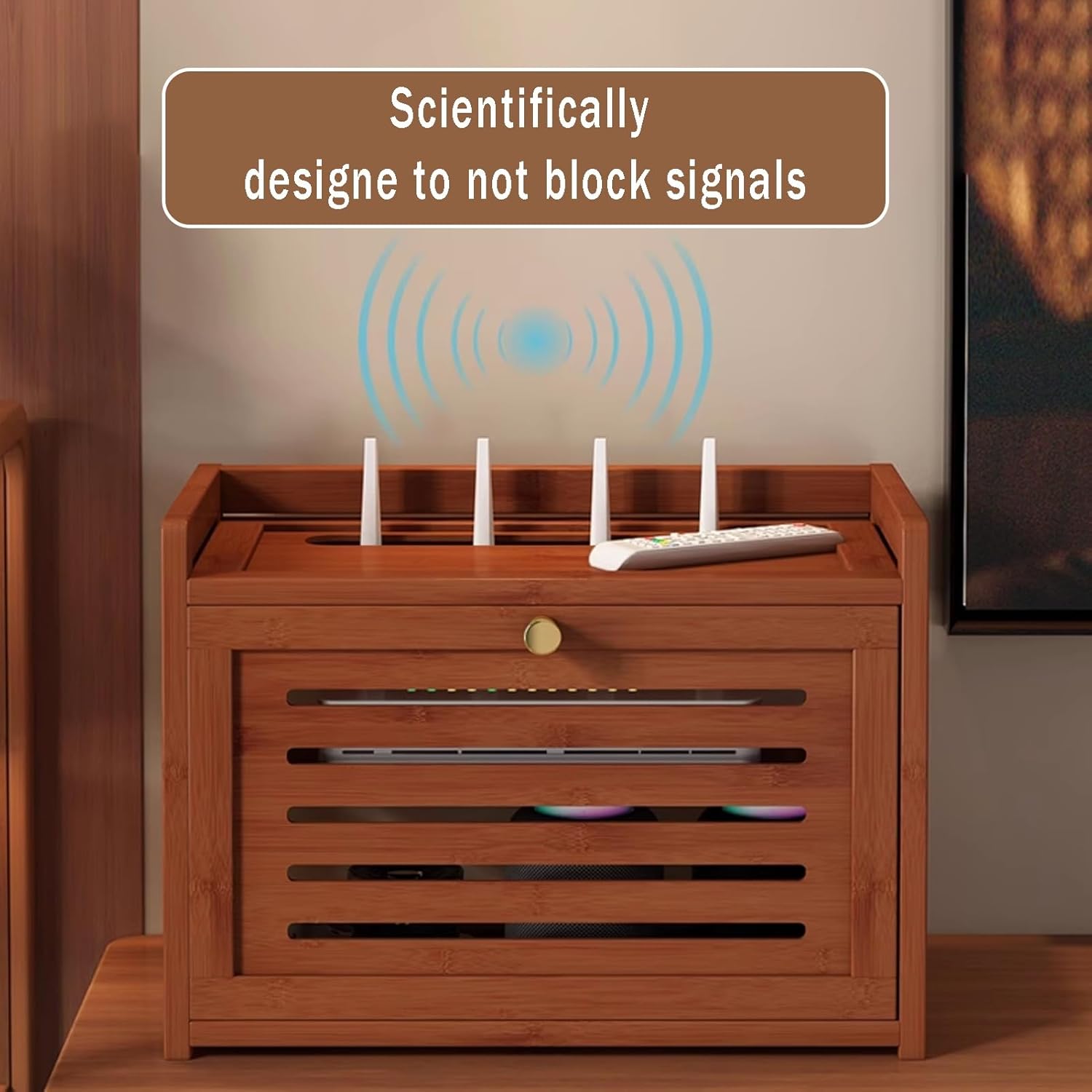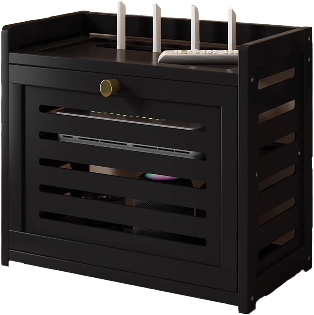 Upgrade your home organization with our WiFi Router Storage Box, an essential accessory for modern living spaces. This multifunctional storage solution is designed to neatly house your wireless router, set-top box, and power strip, optimizing your area while enhancing your entertainment setup.Crafted from high-quality bamboo, our router shelf not only exudes a contemporary minimalist style but also offers durability and sustainability. The two-layer structure maximizes storage capacity while minimizing clutter, making it perfect for any room, from living rooms to home offices.One of the standout features of our WiFi Router Storage Box is its innovative hollow panel design, which prioritizes heat dissipation. This design ensures optimal airflow, keeping your electronic devices cool and functioning efficiently, which is crucial for maintaining a strong signal and prolonging the lifespan of your equipment.Available in two elegant colors—brown and black—this router cabinet seamlessly blends with various decor styles. With dimensions that cater to different needs, you can choose from lengths of 30.5cm (12in) and 40.5cm (15.9in), and heights of 28cm (11in) or 43cm (16.9in), ensuring the perfect fit for your space.Package includes one WiFi Router Hidden Storage Box. Please note, this listing is for the router shelf only; other products are not included. Minor measurement discrepancies of 1-3cm may occur due to different measuring methods. Additionally, color variations may appear due to lighting conditions.Transform your space and enhance your wireless experience with our stylish and functional WiFi Router Storage Box.