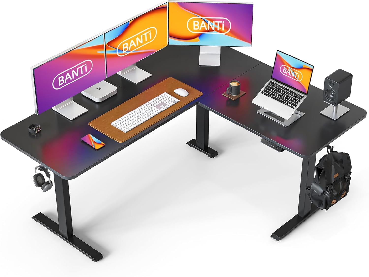 BANTI L-shaped height adjustable electric standing desk can help you change the way you work. You can easily switch from sitting to standing in seconds, relieving neck and shoulder discomfort and back pain; the 63" extra-large workspace puts you in the ideal working position and improves your productivity.