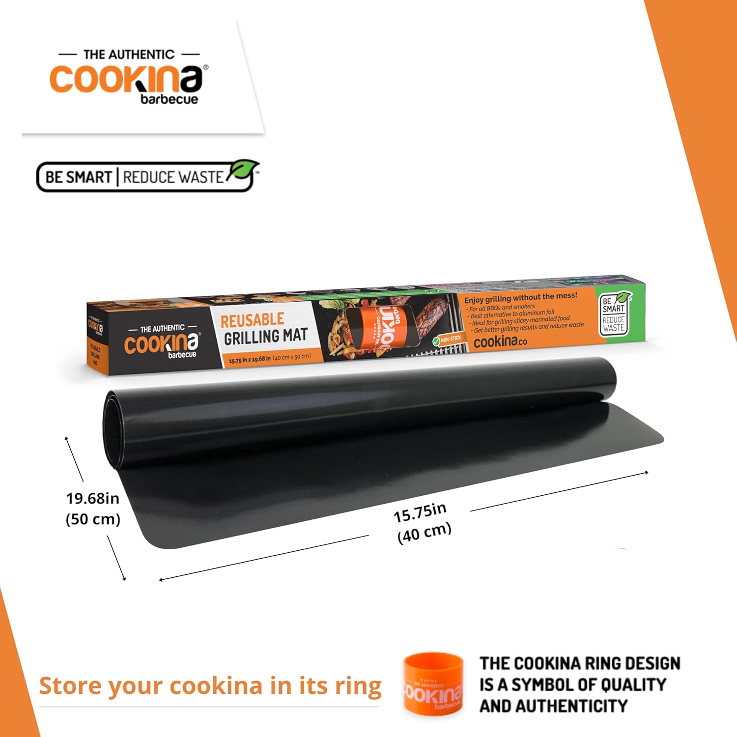 Cookina Non-Stick Reusable Grilling and Cooking Sheets help you save money and cut clean up time, all while delivering delicious food with less fat and fewer calories. These 100% non-stick surfaces are constructed with high quality food-safe materials that allow cooks to easily manage meats, veggies, and more. They're perfect for barbecue grills, smokers, ovens, baking sheets, and other cooking surfaces. Cookina is dual-sided and reusable, making it far less expensive over time than cooking with aluminum foil, parchment, wax paper, or cooking sprays. Cookina Barbecue and Parchminum Sheets release food easily, eliminating the need to add fattening cooking sprays or oils to your food. Grilling and cooking with Cookina helps keep your BBQ grill and oven clean. And because Cookina lies on top of grill grates, you can cook with confidence on park and public grills during cookouts and camping trips. What's more, the silver surface of the Cookina Parchminum is especially suited for attractive food presentation and non-stick serving convenience. Clean-up with Cookina is incredibly easy and takes less than a minute--simply wipe it clean in soapy water after use. There's no need to scrub or scour, plus Cookina is dishwasher safe. Using Cookina is far easier than having to scrape food debris from grills, grates, and pans. Cookina holds no odors or flavors from previous uses, even with fish, poultry, or marinated food. Its thin, tough construction can be cut to fit your cooking surfaces with no loss of performance. Cookina Sheets have a maximum operating temperature of 550 degrees (288 C.). They are constructed with non-toxic and chemically inert PTFE (popularly known as Teflon). Each double-sided non-stick surface is incredibly durable and 5 times thicker than what is found in most non-stick frying pans.