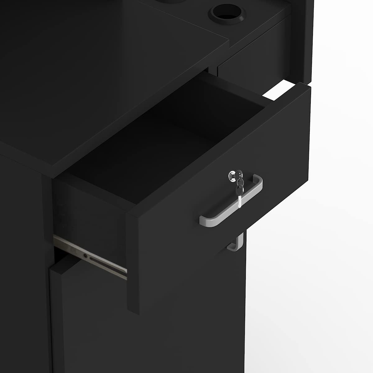 This Locking hair styling station is made of high quality MDF ABS plastic, which is durable in use. The MDF board surface is veneered in slick uniform black color. The veneer decorative board increases the brightness of the surface, protects the surface from worn, and is easy to clean.Features:- Laminated durable melamine surface- Easy to install (assembly required)- 6 reinforced hot tool holster- 2 pullout drawers & 1 cabinet at the bottom- Locker & Aluminum Alloy HandleSpecifications:- Material : MDF & ABS Plastic- 6 Plastic Rimmed Inserts Diameter:1.8"D / 3.1"D- Overall dimension: 26.5"L x 13.8"W x 38.2"H- Drawer dimension(Inner): 14.2"L x 11.4"W x 4.3"H- Bottom cabinet dimension(Inner): 16.5"L x 12.6"W x 22.4"H- Product Weight: 42lb / 19kgPackage Includes:1 x Salon Station1 x Installation Manual