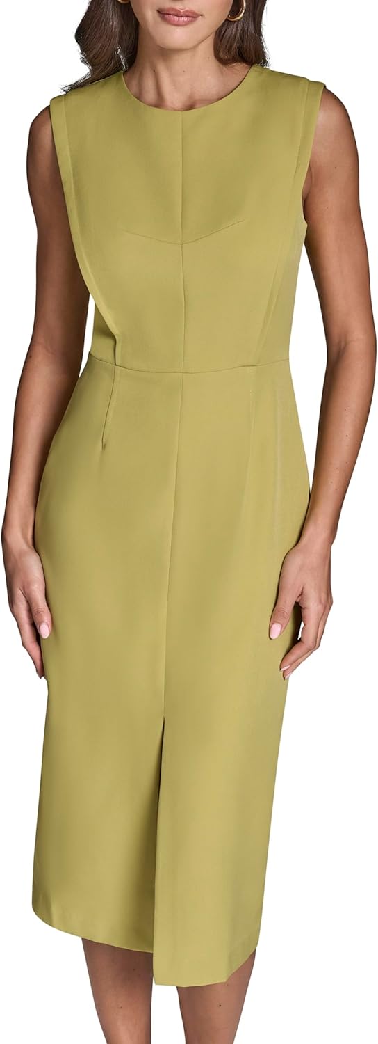 This BCBG Women's Dress is a Sleevless Round Neck Front Slit Solid Midi Dress