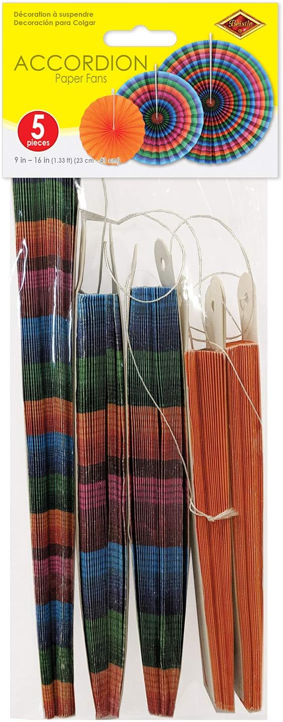 Mexican party decorations Cinco De Mayo Party supplies. 5 assorted color and assorted size paper accordian fans. Assortment consists of 2 - 9 inch orange paper fans, 2 - 12 inch southwest colored stripes, and 1 - 16 inch southwest color stripes. Box of 60 total fans