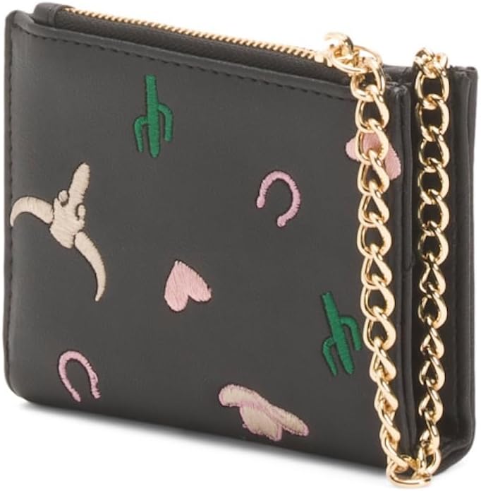 This stylish Betsey Johnson Western Card Case set combines fashion and function with its playful embroidered design. The black pebbled polyurethane exterior features charming Western-inspired details including cacti, hearts, and horseshoe motifs in pink and green embroidery, accented with elegant gold-tone hardware and brand logo. The set includes a main card case measuring 4.75 inches wide by 3.5 inches high, plus a complementary pink card holder. The versatile gold-tone chain wristlet strap allows for easy carrying while keeping your essentials secure. Inside, you'll find thoughtfully designed organization with multiple card slots, an ID window for quick access, two interior slip pockets, and a currency pocket to keep your cash organized. The exterior offers additional convenience with a front slip pocket for frequently used cards and a back zip pocket for extra security. The snap button closure keeps everything safely contained. This two-piece set is perfect for those who want to carry just the essentials while making a bold fashion statement.