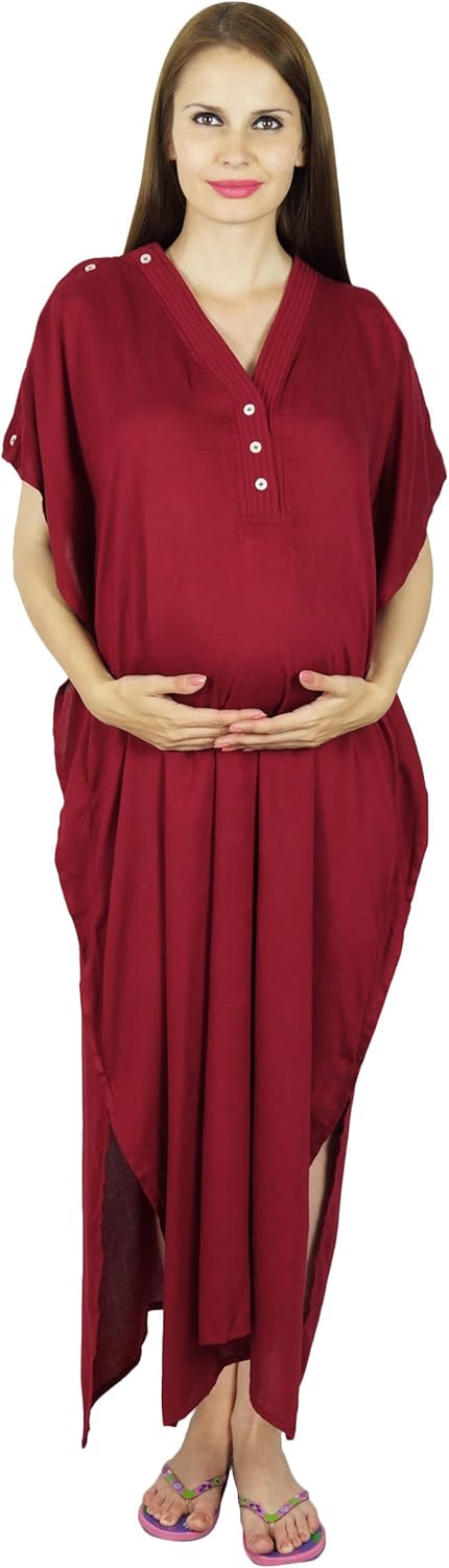 Bimba Introduces a new range of Maternity Kaftan. Perfect for Nursing mothers and Pregnant womens. All the Kaftans have deep necks (11-12 inches) so will fit all head sizes. Buttons on the front and one shoulder makes the already super comfortable kaftans even more so making it a perfect gift for Moms and to be Moms. You can wear it while you are pregnant or after the baby comes.* This is a beautiful maroon kaftan with Buttons on the front down to the waist and one side shoulder for easy nursing. Also has slits at both hems to allow more leg freedom as needed.*** It comes with a belt which you can tie just under bust as per your suitability.**** We offer different circumference in these Kaftans. So you can choose your required size. Kaftans are worn little loose so make sure you buy correct size. If your bump size is 48" inches then please buy bigger circumference and not exact.Material: Rayon Color: MaroonWash Care: Dry Clean or hand wash in cold or mild. | Air Dry Only | Do not bleach | Iron it when slightly damp