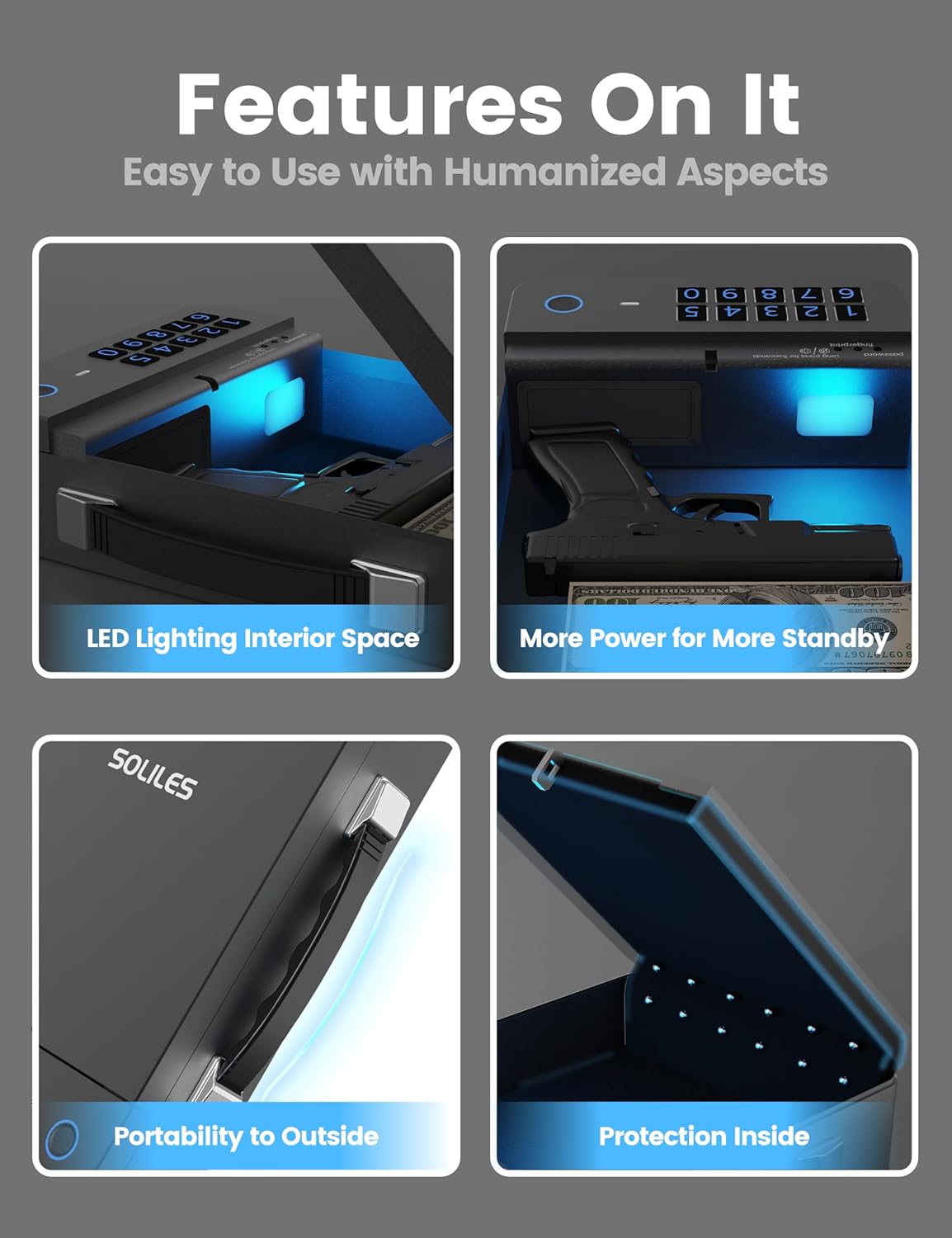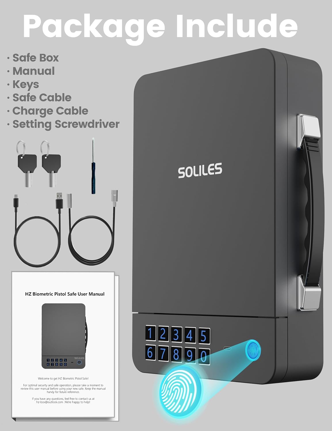 | Lock Type | Biometric, Electronic Combination Lock, Key |