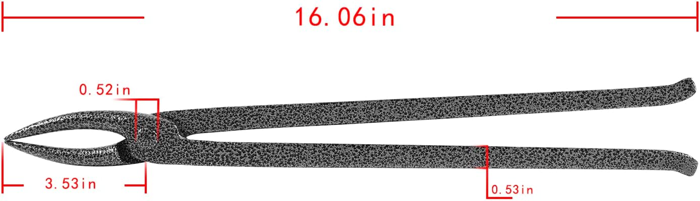 Newly Upgraded Professional Blacksmith TongsMaterial upgradeHigh Quality 5160 SteelLighter and stronger than other tongsMore comfortable grip and less fatigue on your hand.Cleaned in a vibratory tumblerFinished with a dry linseed oil/turpentine mix, rust inhibitor.Not a greasy or oily finishTongs DimensionsThe tongs are approximately 16 inches long.The jaws are approximately 3-1/2" long, 3-9/10" wide.The reins are approximately 12-1/2" long.Simple OperationPerfect for beginners as well as professional blacksmiths and forging enthusiasts.Comfortable grip, not a greasy or oily finishDouble J-shaped reins ends for no slippageNot easy to wear and maintain long-term clamping capacity and clamping angle.This type of blacksmith scrolling tong allows for maximum control and leverage while bending yellow hot metal.The unique curved jaw design allows you to easily grip various thicknesses of stock and don't need to drastically change the gripping width of the tong handles.It can fully articulate and supply exceptional gripping strength on the work-piece When bending the forged part.This single pair of scroll tongs much more versatile than standard; straight-jaw scroll tongs.DIY various forged items, enjoy the fun of blacksmithingNote: When cooling this scroll tongs, you need to rapidly dunk the tongs in water, in and out quickly, allowing the tongs to cool slowly. This can effectively prevent the material from becoming hard and brittle, maintaining a long service life of the tongs.