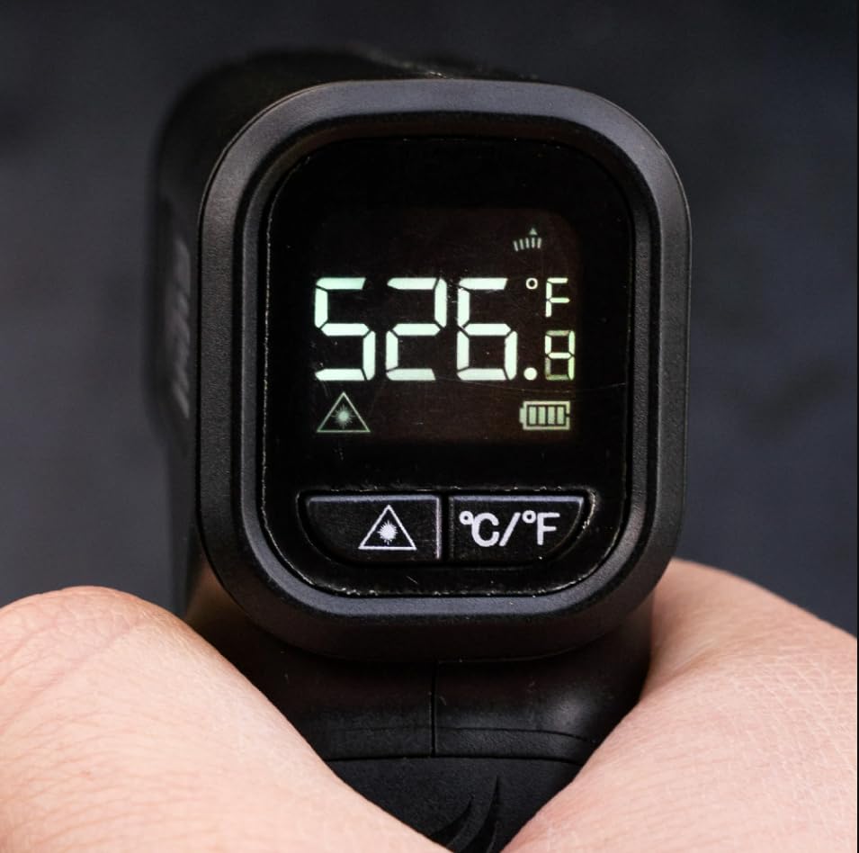 Pinpoint surface temperatures in your pizza oven or on your griddle with this Blackstone Infrared Thermometer. Equipped with a precise laser for accurate surface temperature readings without needing direct contact with the cooking surface, and a digital screen with options to show the temperature in Celsius or Fahrenheit, you can confidently ensure your food is in the right environment to be cooked to perfection. Producing temperature readings from -58°F to 932°F, this thermometer ensures that any food you cook is at its desired heat range. Extra features such as a secure wrist strap, low battery indicator, and a 30-second auto shutoff save power and increase usability, and two AAA batteries are included in the packaging so your thermometer is ready to use as soon as you get it.