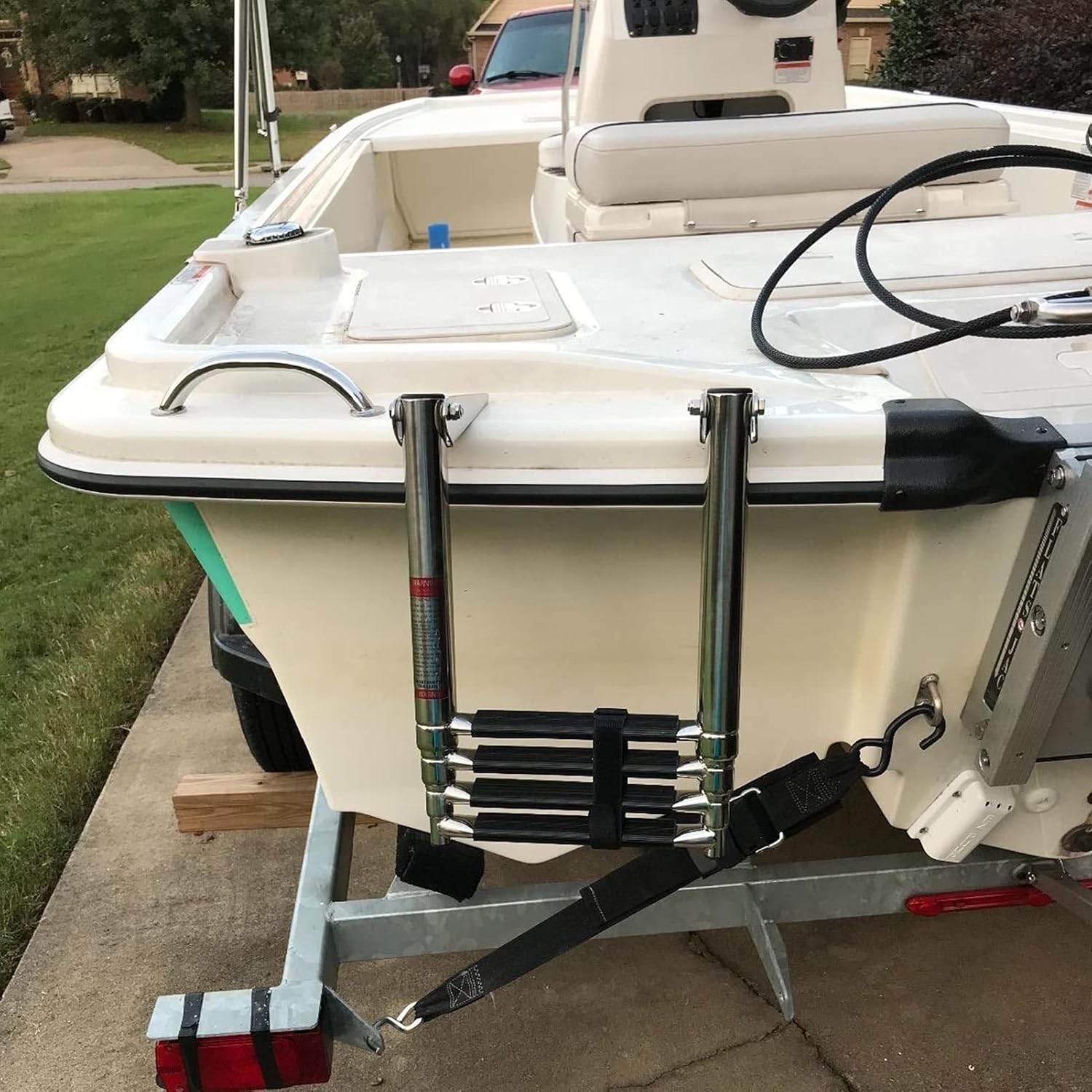 - Platform Boat Ladder 1. This boat ladder is made to be bolted to a horizontal platform such a the boat floor or side railings depending on the installation. 2. The design of this platform ladder makes it possible to be used as on a pontoon boat. 3. Some of customers have also used this as a low profile dock ladder.4. Installation is very easy, simply bolt the ladder to a horizontal platform and you are ready to use it! - SpecificationMaterial: Stainless SteelMaximum user weight: 330 lbs (150kg)- Most liked features:For both individual and professional useDurable, and rustproof it's well worth the money - Technical features:1. Extra wide telescoping steps for more comfort when boarding. Easy boarding.2. Heavy duty welded stainless steel pontoon ladder. Unique universal self supporting design requires no support.- Please Note: Do not place your hands or fingers between the rung when closing the ladder.- Package contents:1 x Ladder
