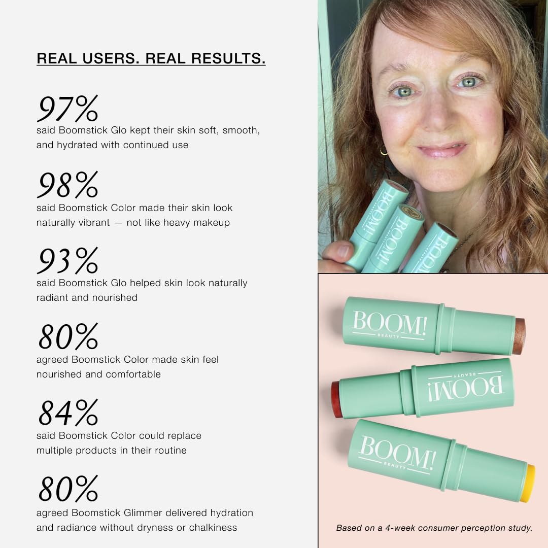 Acknowledging the changes our skin undergoes with age, this cream blush stick and lipstick duo is thoughtfully formulated to provide a dewy glow—ideal for mature skin. Experience the versatility of our multitasking product, perfect as a cheek and lip tint, contour and blush stick, or even a touch of color for the eyes. Whether you're looking for a cheek blush, lip blush, or an everyday face blush, this stick does it all. Our multi stick makeup—also called a multistick makeup or make up stick—delivers sheer, buildable color that complements every skin tone. Designed specifically for older women, it works beautifully as a stick blush for cheeks for older women and a creme blush for cheeks for older women, offering a luminous, youthful finish. Crafted with clean, non toxic, and vegan blush ingredients like nourishing sunflower and jojoba seed oils, mango seed butter, and shea butter, our clean blush formula is part of our PRO-AGE cosmetics and skincare line, which embraces aging while supporting skin health. We take pride in ethical sourcing and creating formulas free from harmful chemicals and never tested on animals. Boomstick Color is a travel blush and pocket blush essential—travel size blush that easily fits in your makeup bag for on-the-go touch-ups. With sheer pigments that let your natural skin tone shine through, this glowy blush enhances your complexion with softness and radiance. It also functions as a long lasting blush, giving you vibrant, healthy-looking skin that lasts all day. Whether you're replacing your blushes, lipsticks, or bronzers, our one size blush solution makes it easy to simplify your routine. Just dab Boomstick on your cheeks, lips, decolletage—anywhere you naturally get color—for an effortless, natural-looking cheek stain blush. At BOOM Beauty, we believe beauty knows no age. With our makeup for women over 40, embrace the journey of aging gracefully while celebrating it.