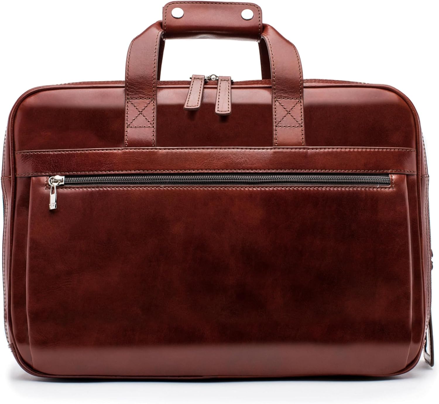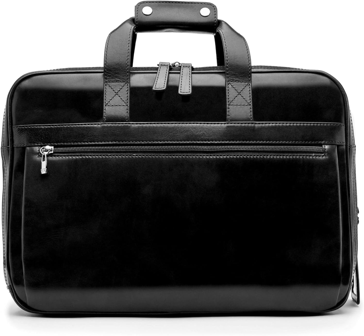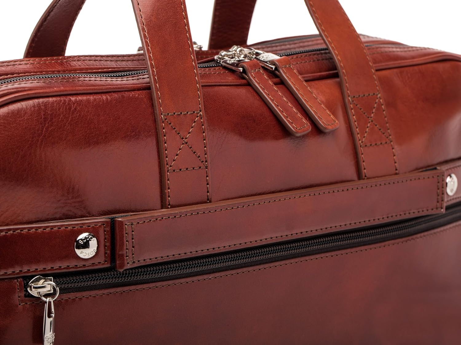 This Stringer Bag is part of the Bosca® Old Leather Collection. Make a statement at every meeting you walk into with the stunning Stringer Bag from Bosca. Laptop compartment can accommodate up to a 15.4" laptop. Leather's color is applied by hand-sponging vegetable dyes onto the leather according to a centuries-old Tuscan technique and then ironed to produce a deep and varied color that allows the hide's natural features to show through. Versatile transport options allow you to carry the case by hand using the handle grips, over your shoulder using the padded and removable shoulder strap or slipped over most upright using the back strap. Zippered gusseted pockets on the front and back of bag provide quick-access storage for smaller items such as keys, badge or ID, and cell phone. Forward zippered compartment features a large open-top pouch to safely hold your beloved laptop. Rear zip compartment features three open-top pouches and a full-length zip pocket for keeping your business accessories neatly organized. Interior is lined in light-colored tweed weave poly/cotton to protect your important items from getting scratched. Measurements: Bottom Width: 16 in Middle Width: 16 in Top Width: 16 in Depth: 4 in Height: 12 in Handle Length: 3 in Accessory Strap Length: 18 in Weight: 3 lbs 12 oz