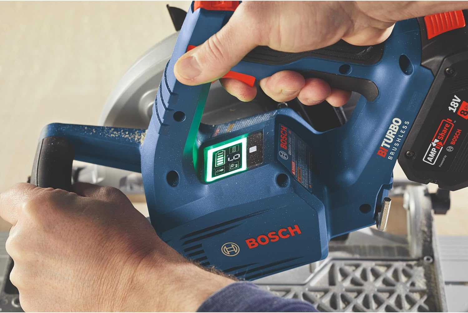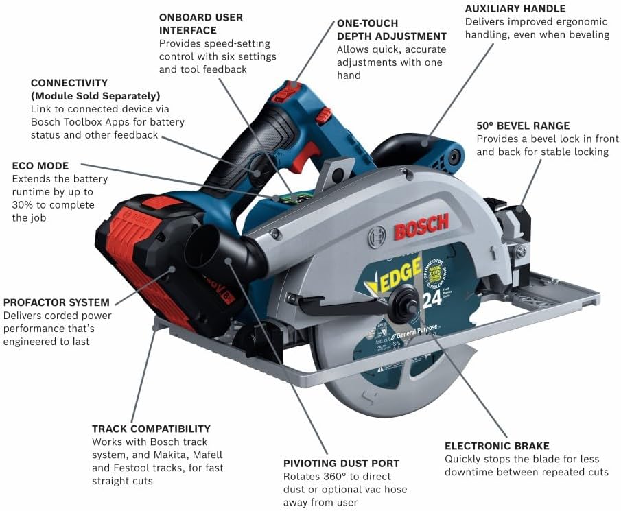This circular saw delivers corded performance from an 18V cordless 7-1/4 In. saw. The Bosch GKS18V-25C 18V 7-1/4 In. BITURBO Brushless™ Circular Saw has a 2-1/2 In. cut capacity, easily cutting through 2x (“two by”) material across the entire bevel range. This circ saw is part of the PROFACTOR™ System, which pairs BITURBO Brushless™ Technology with a CORE18V® High Power Battery. BITURBO Brushless™ Technology is a high-performance motor and drive-train system designed to deliver power comparable to high-demand corded tools. It features connectivity (module sold separately), which links users to a connected device via the Bosch Toolbox App to receive detailed feedback. It has a 0-50° bevel range while the auxiliary handle improves stability and handling. It has an electronic convenience brake for less downtime between cuts and a 360° pivoting port directing dust away from the body when the saw is held in either hand.
